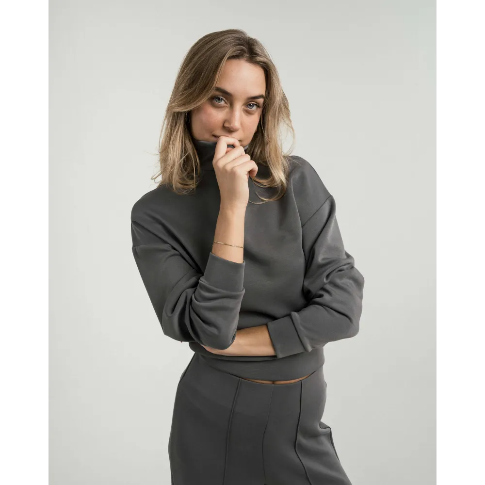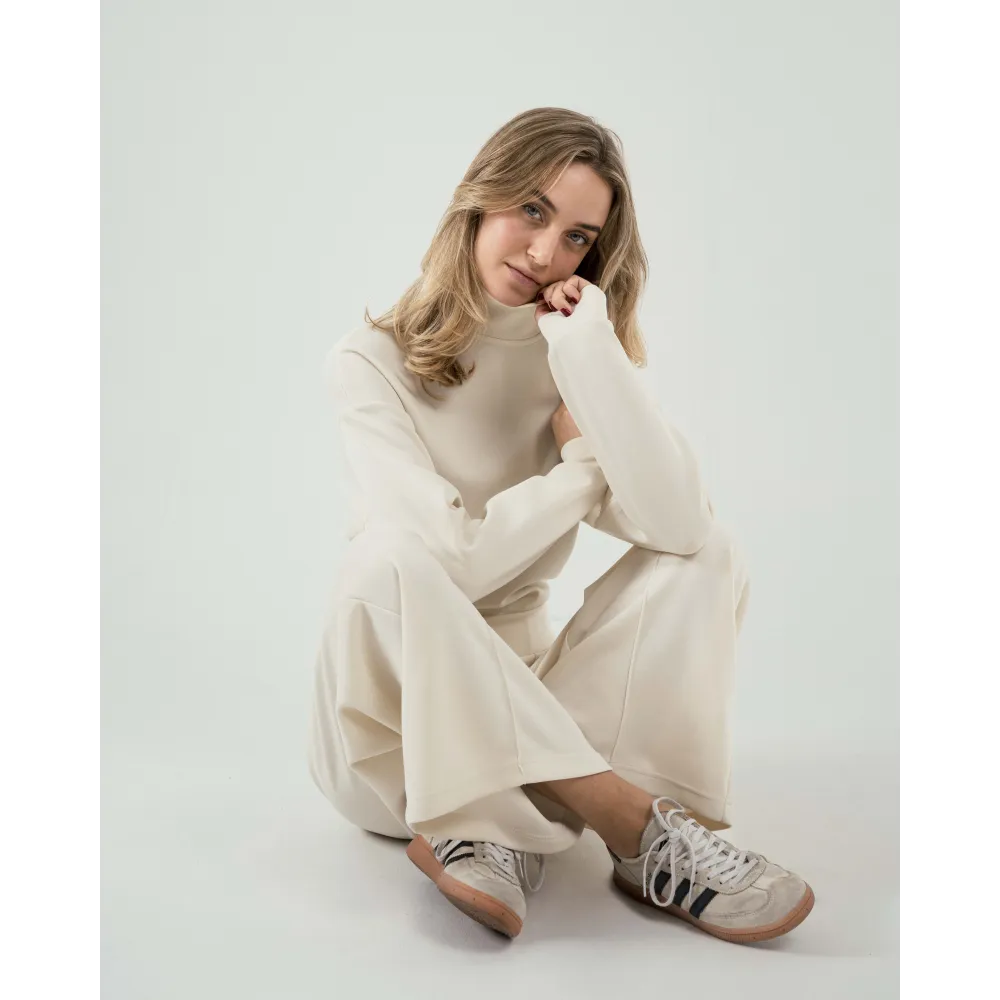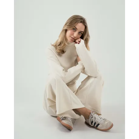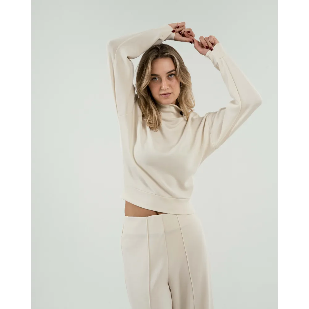 Camisola de manga comprida com gola subida e acabamentos elásticos na cintura e nos punhos que garantem grande conforto.