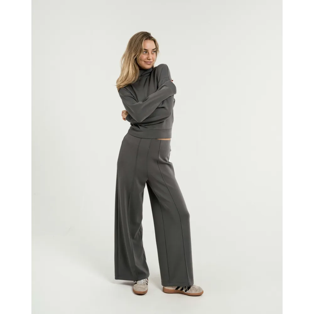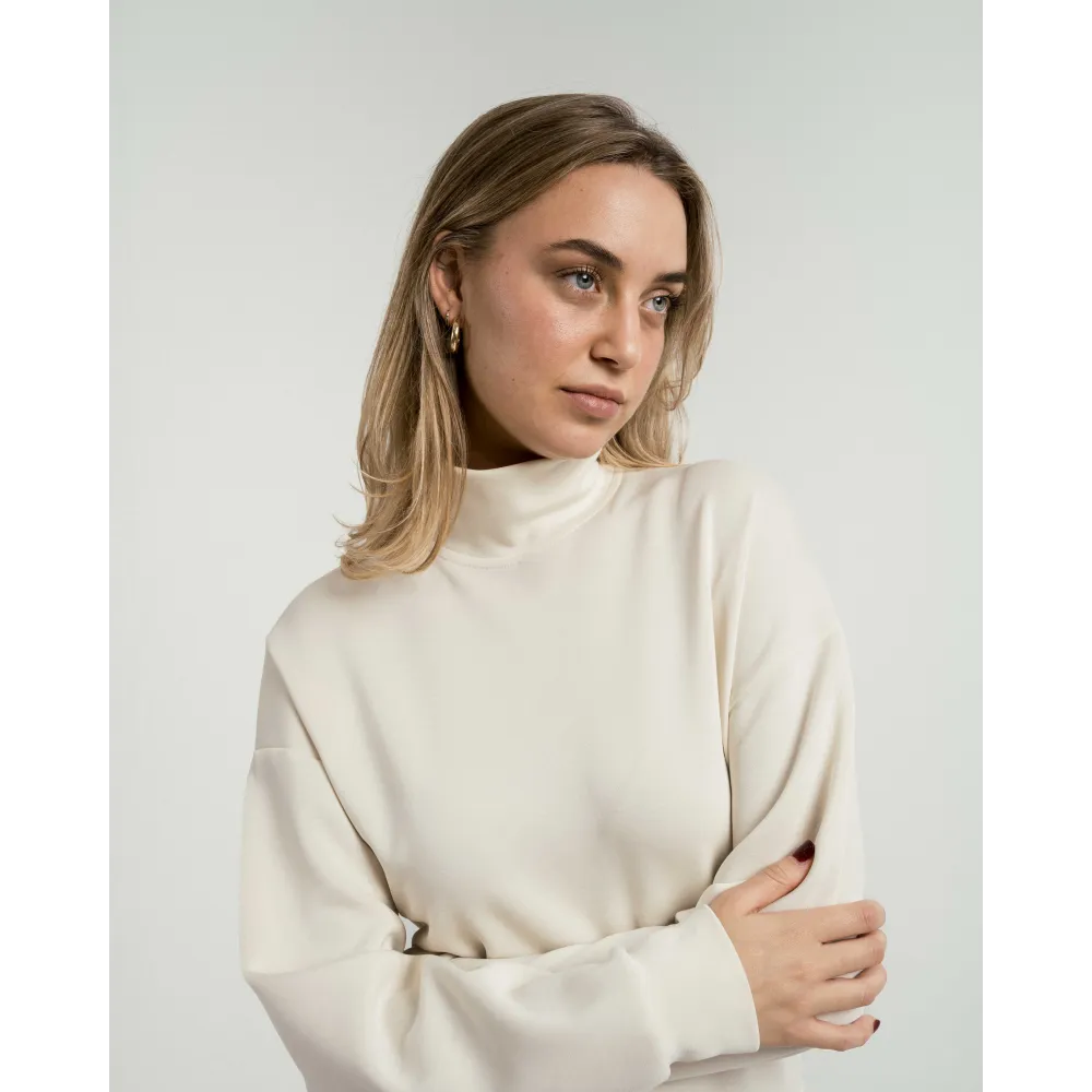 Camisola com gola subida, manga comprida caída e acabamentos elásticos na cintura e nos punhos.