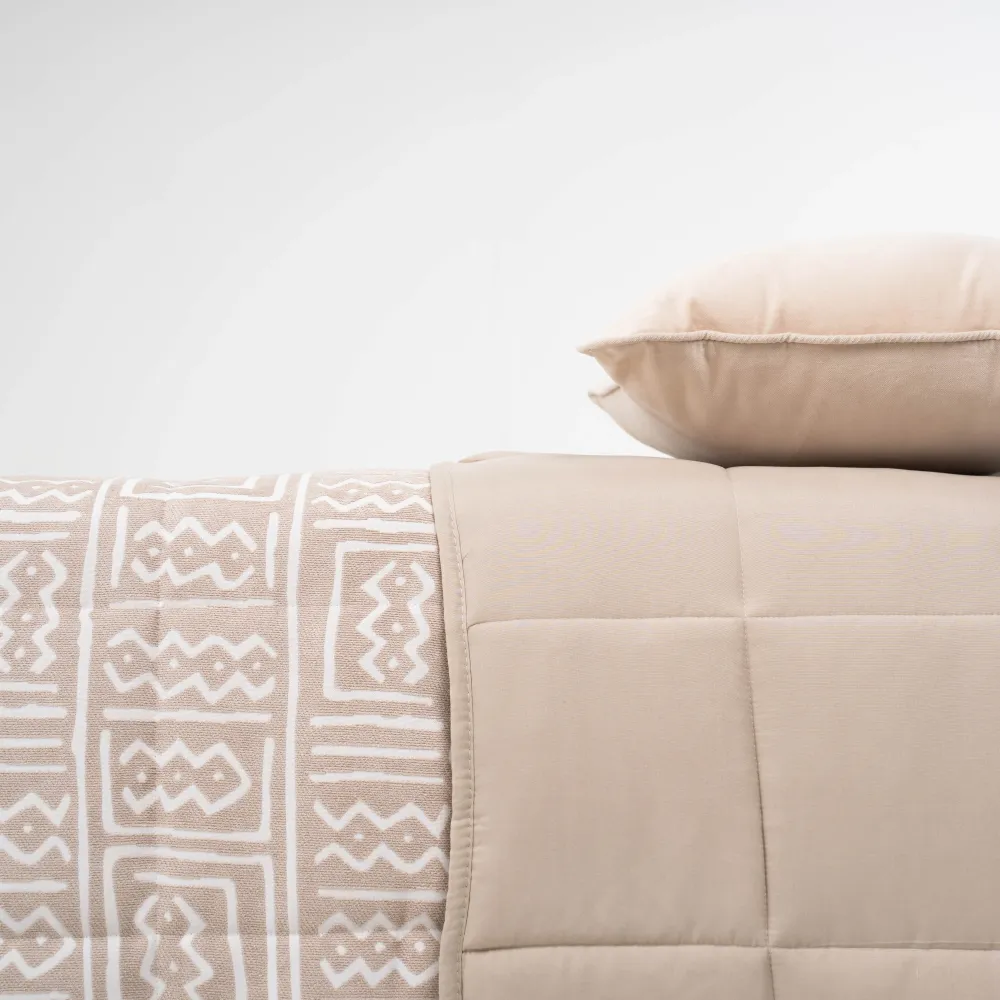 Colcha de 120 g. Face dianteira estampada com um design de estilo étnico em branco sobre um fundo areia em tecido chenille, que confere um efeito brilhante, elegante e original.