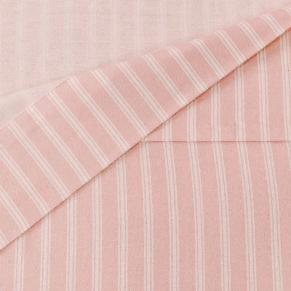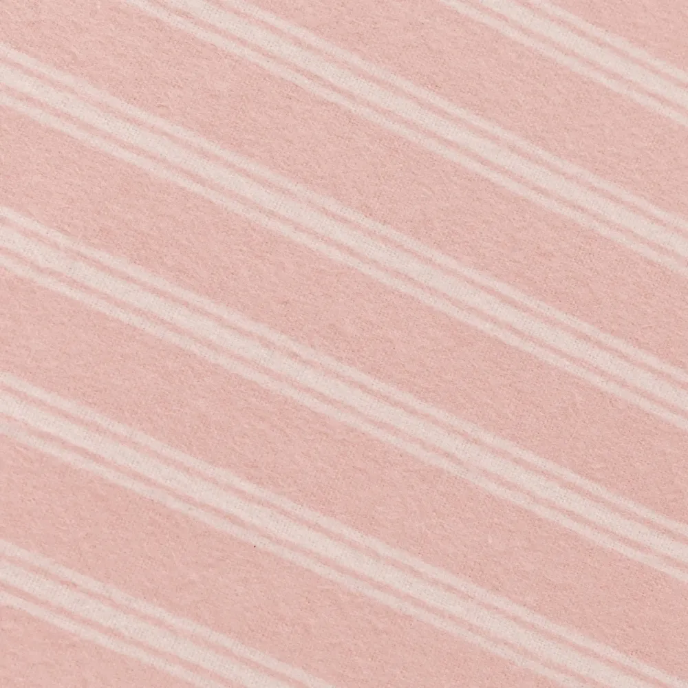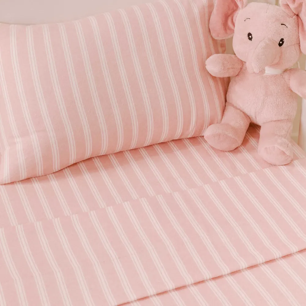 Lençóis e fronha na cor rosa com estampa de riscas brancas em tecido de flanela muito suave, ideais para o inverno devido às suas características térmicas.