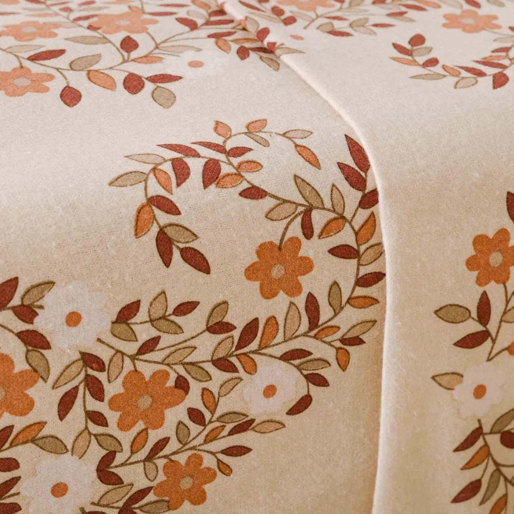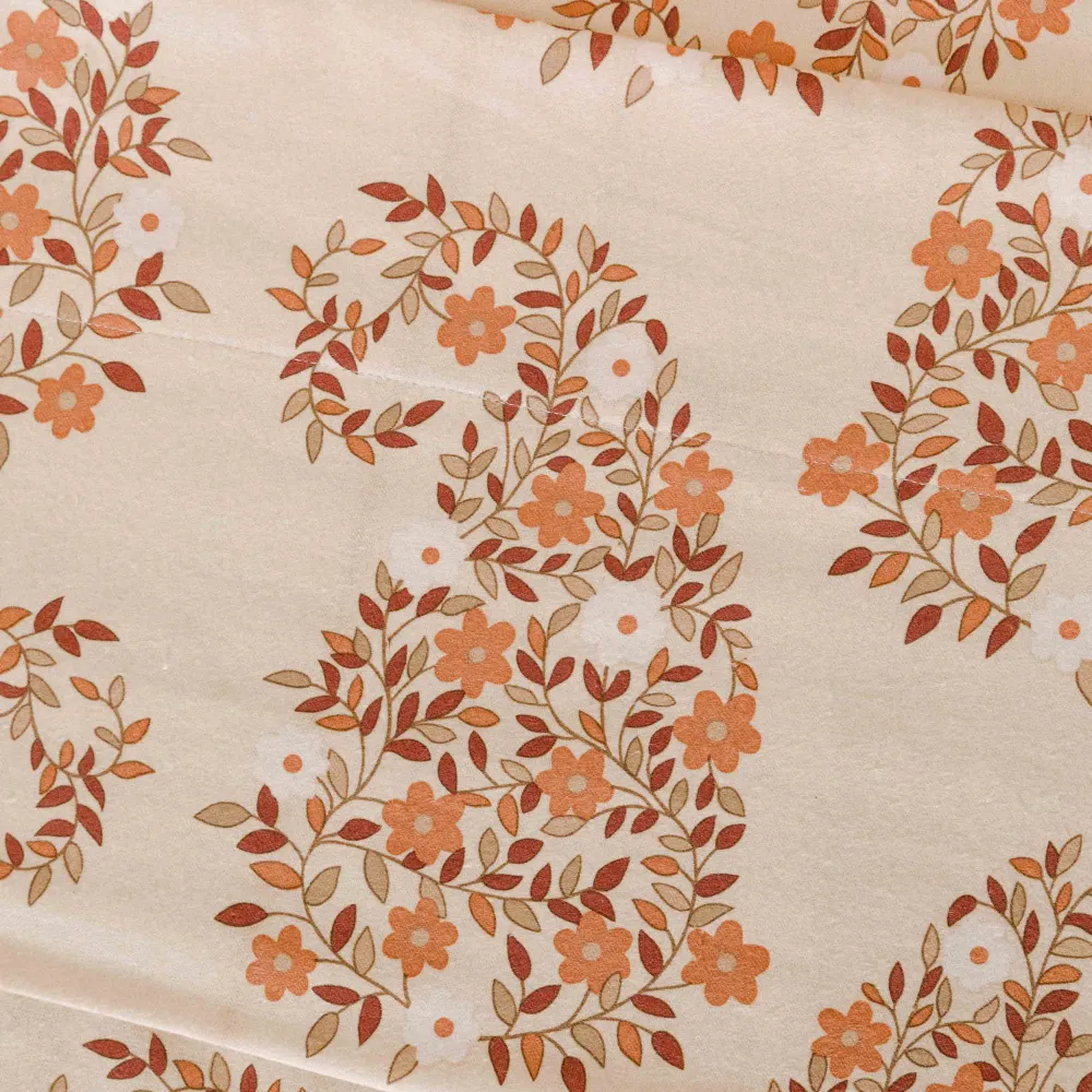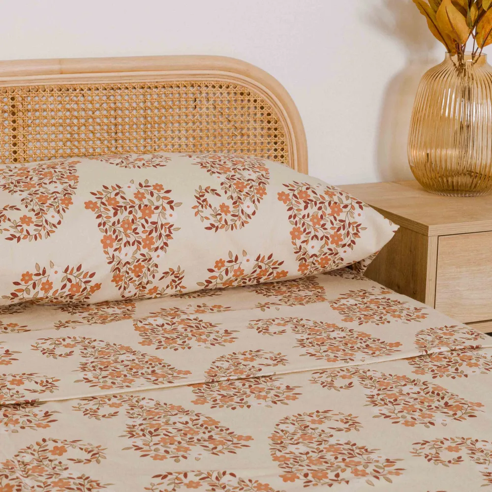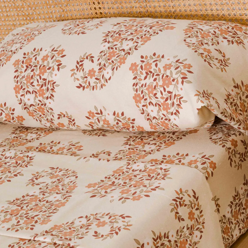 Lençóis e fronhas na cor areia com estampa paisley de flores e folhas em tecido de flanela muito suave, ideais para o inverno devido às suas características térmicas.
