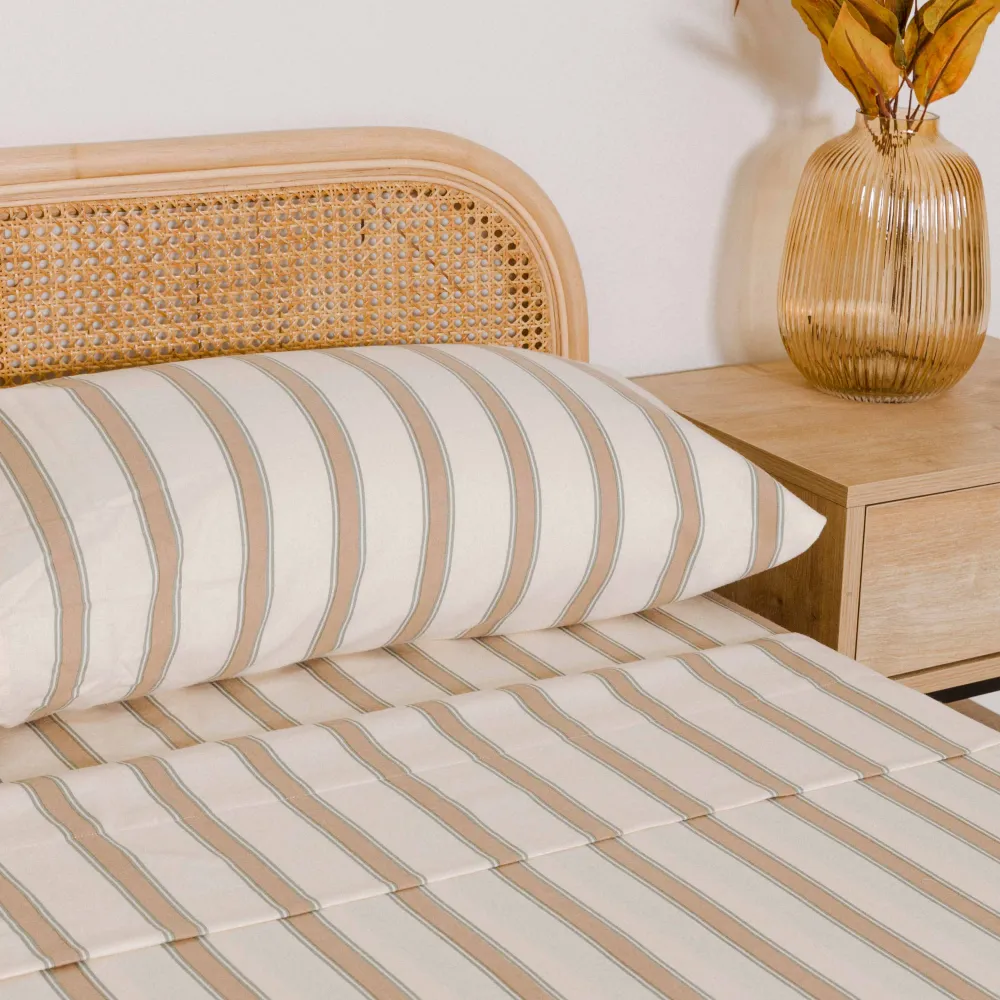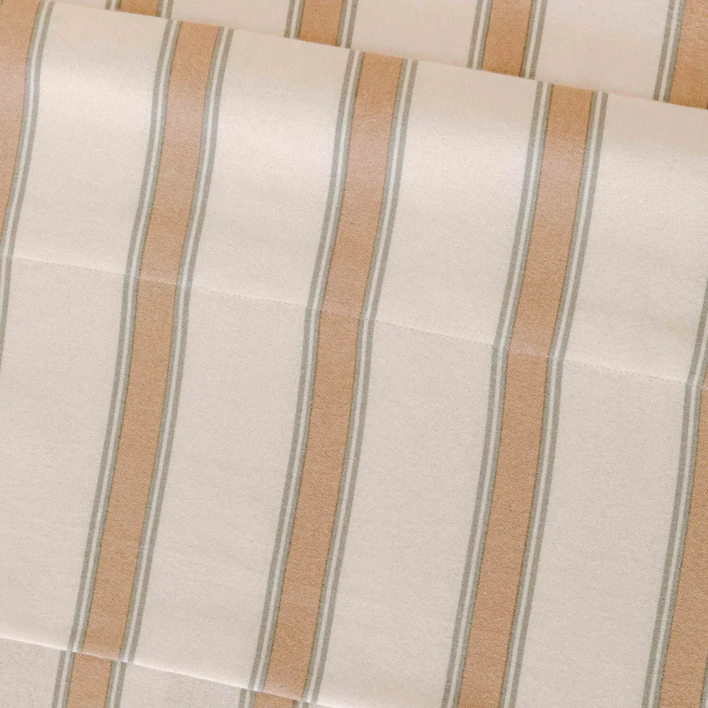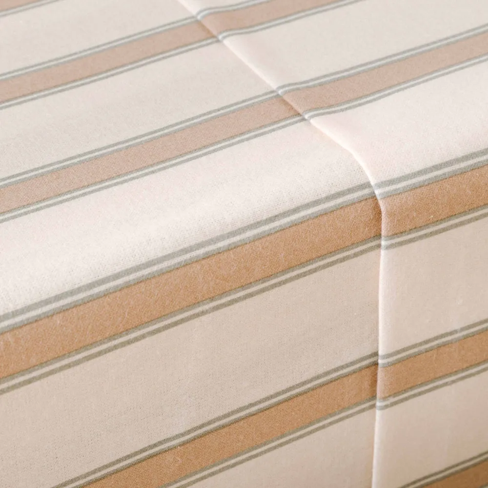 Lençóis e fronhas na cor branca com riscas verdes e areia em tecido de flanela muito suave, ideais para o inverno devido às suas características térmicas.