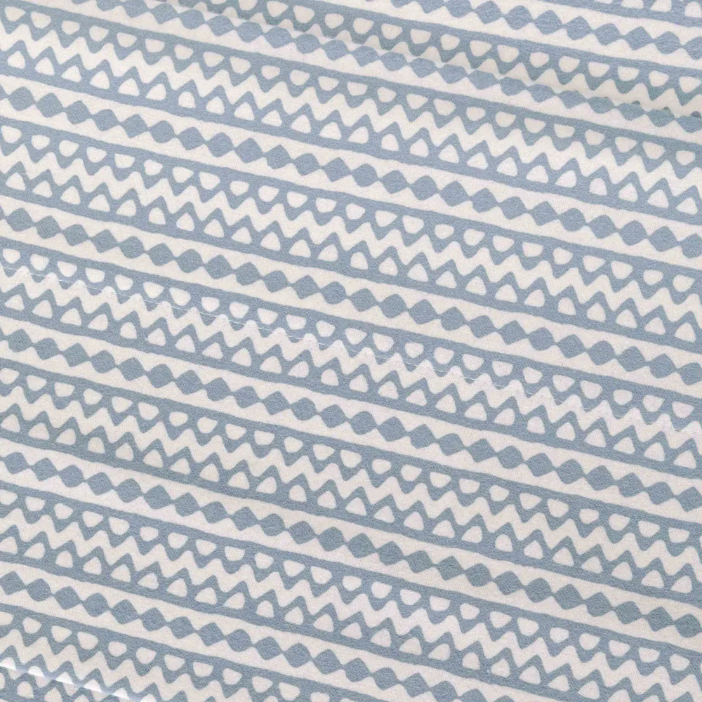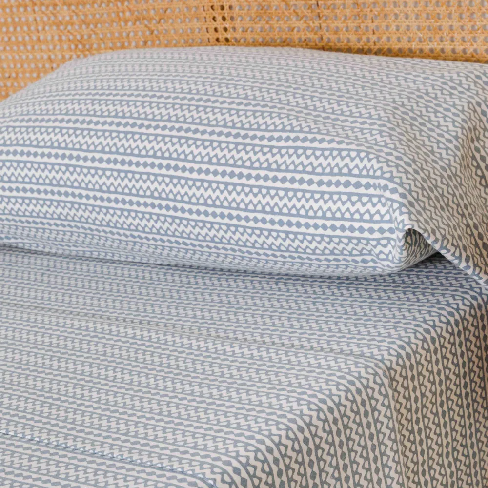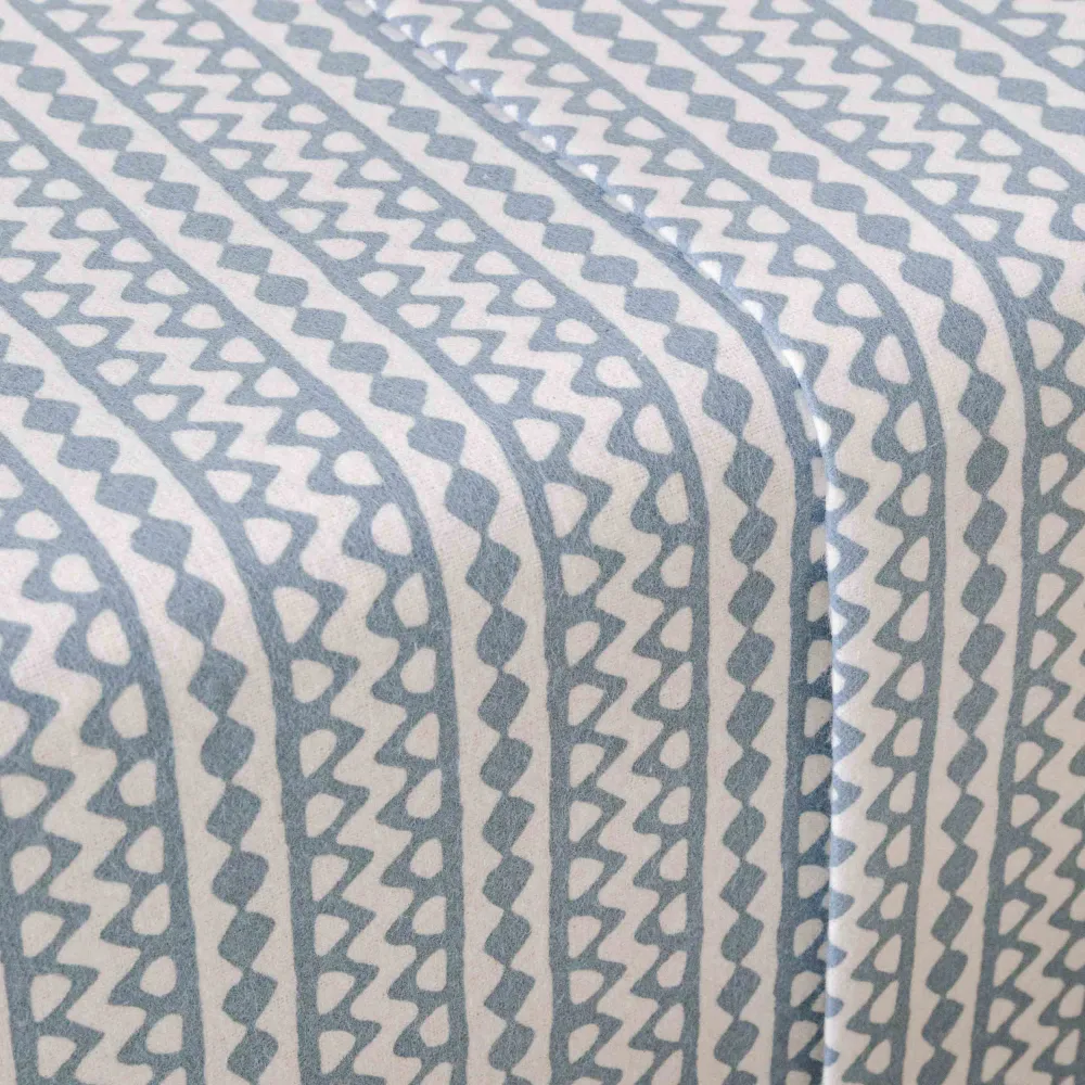Lençóis e fronhas na cor branca com estampa étnica em azul, em tecido de flanela muito suave, ideais para o inverno devido às suas características térmicas.