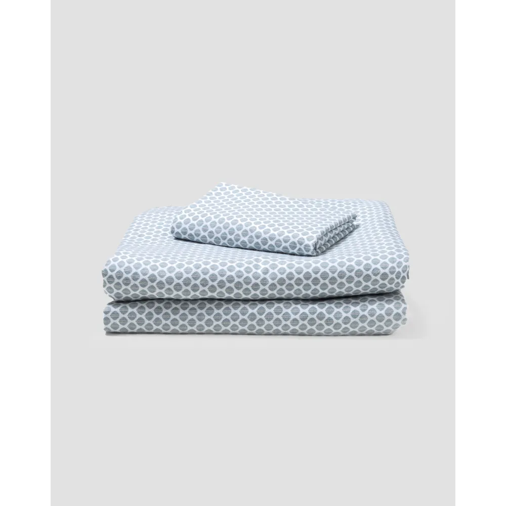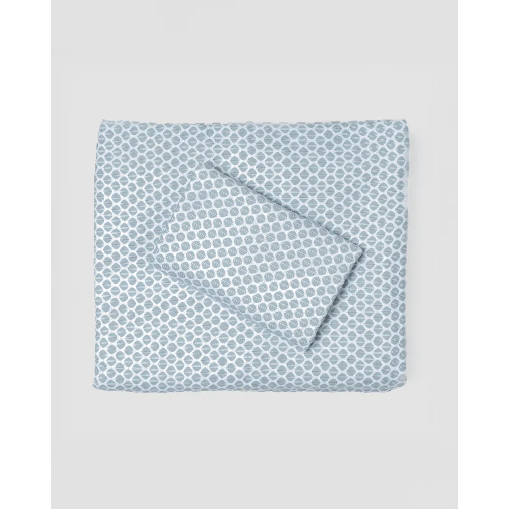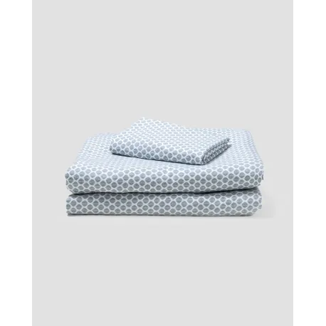 Lençóis e fronhas de almofada de cor branca com estampado de pequenas figuras em tons de azul, em tecido de flanela muito suave, ideais para o inverno pelas suas propriedades térmicas.