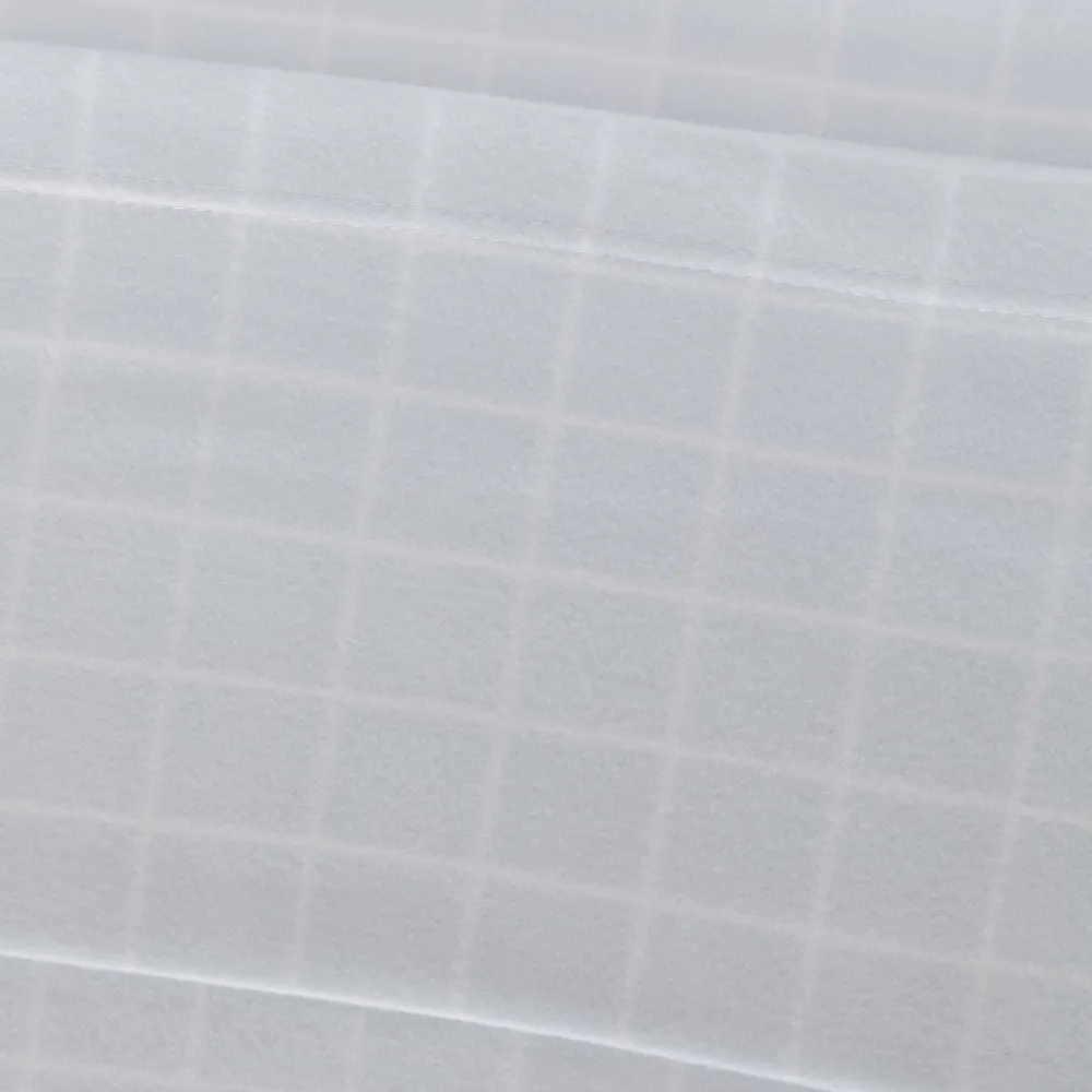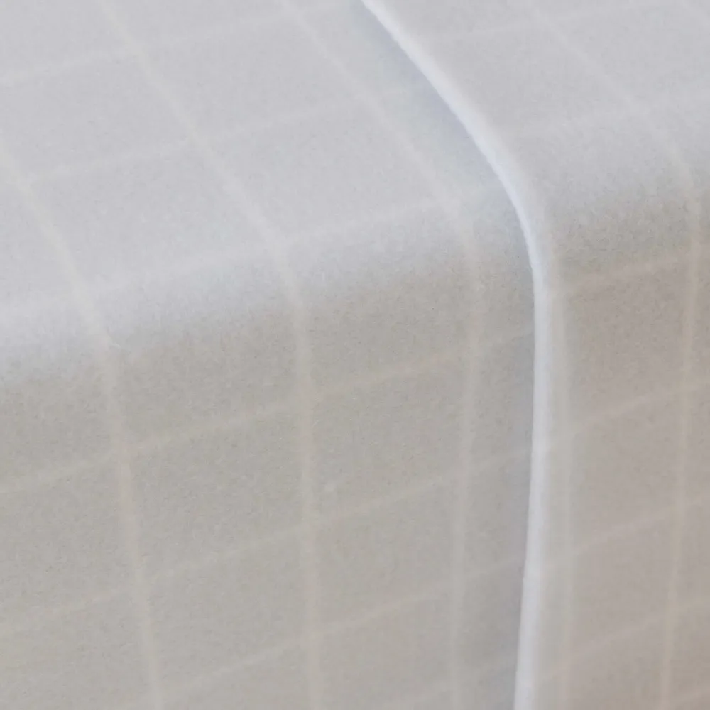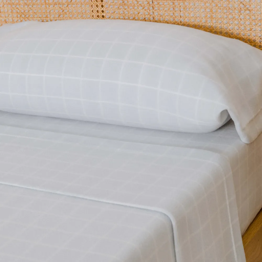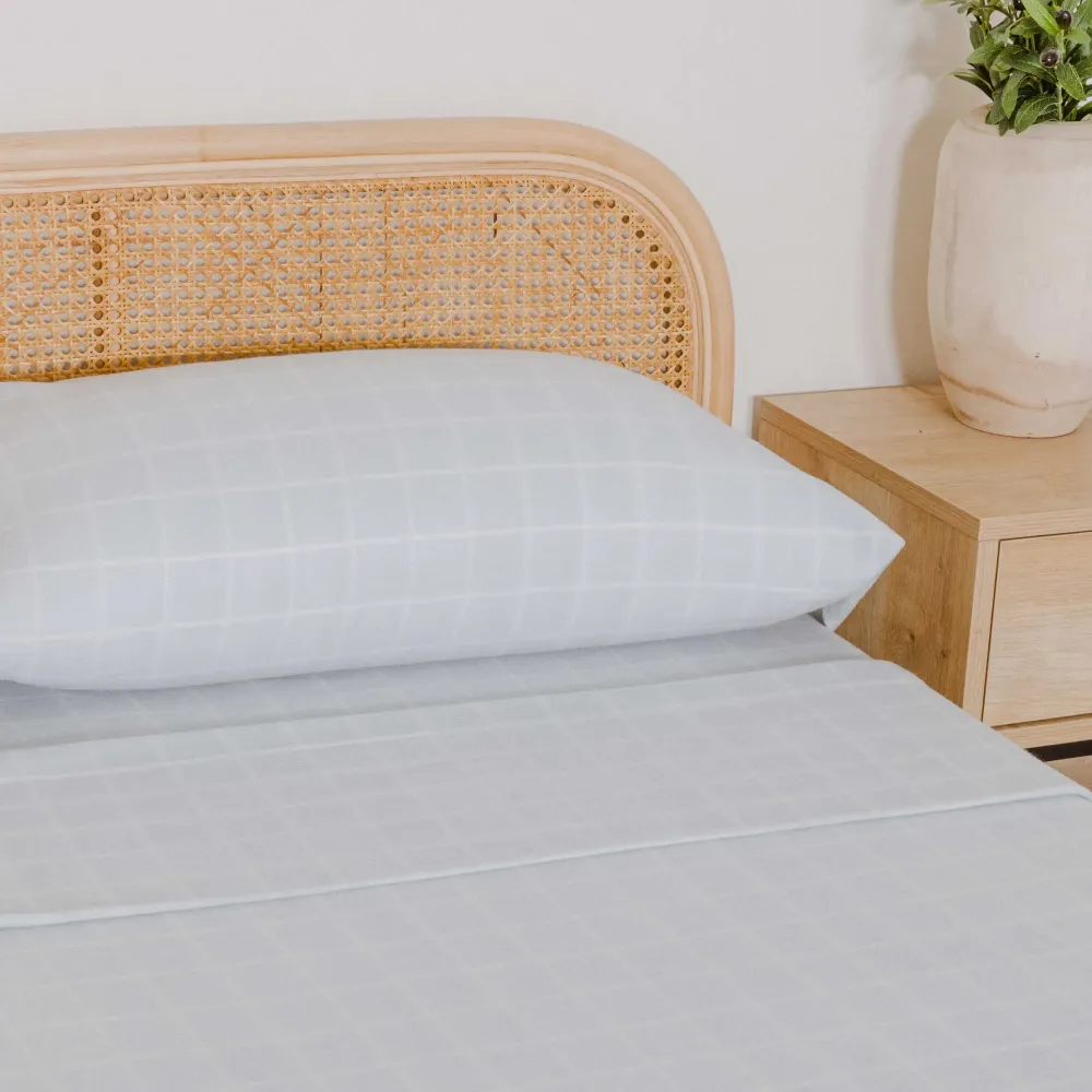 Lençóis e fronhas com estampa simples de quadros brancos sobre um fundo azul-claro.