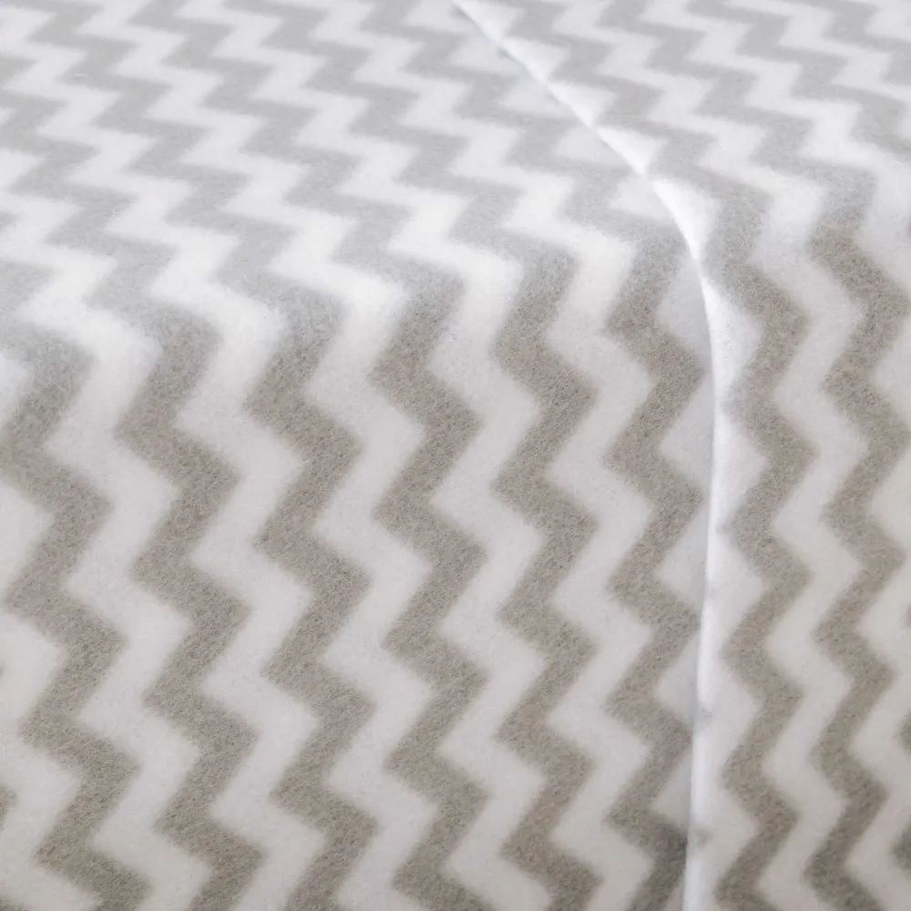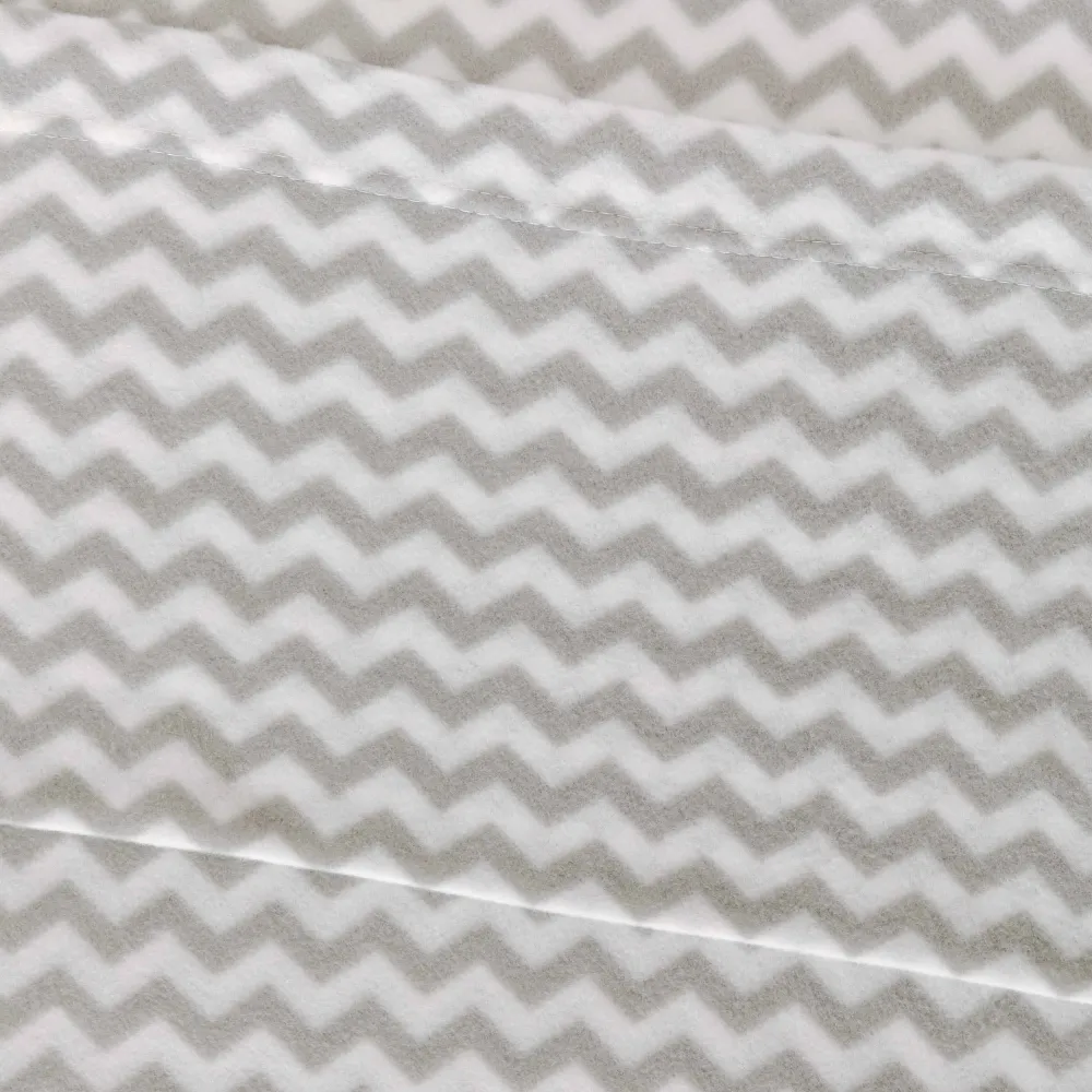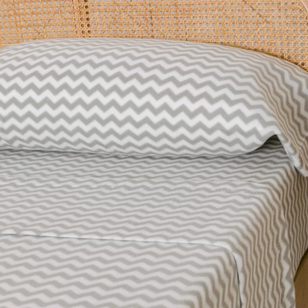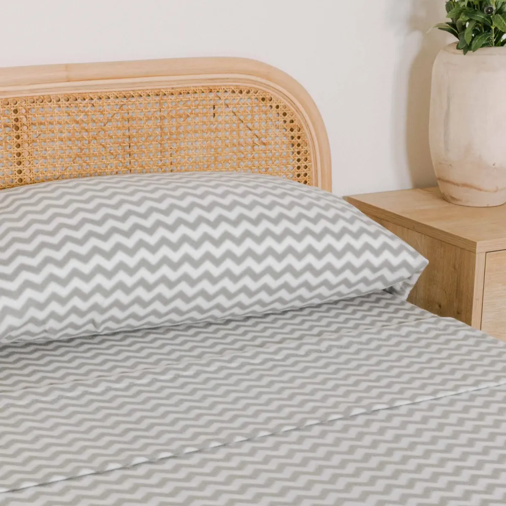 Lençóis e fronhas com estampa de zigue-zague em verde sobre um fundo branco.