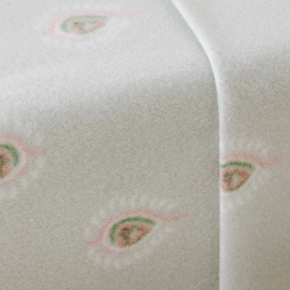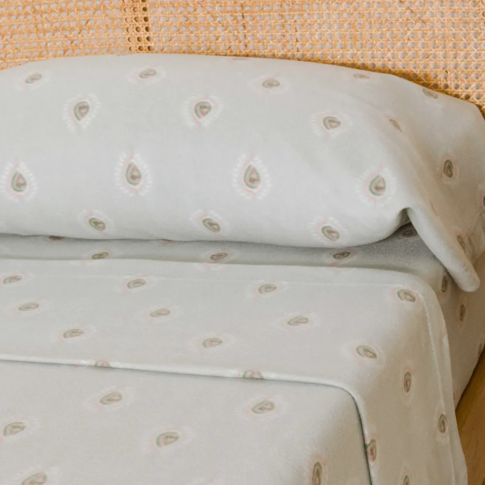 Lençóis e fronhas com estampa elegante de folhas em tons de branco, verde e rosa sobre um fundo verde-claro.