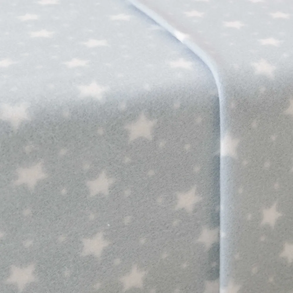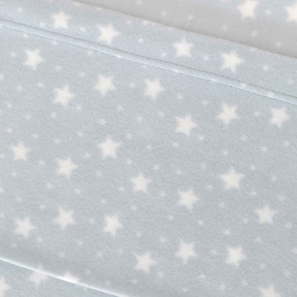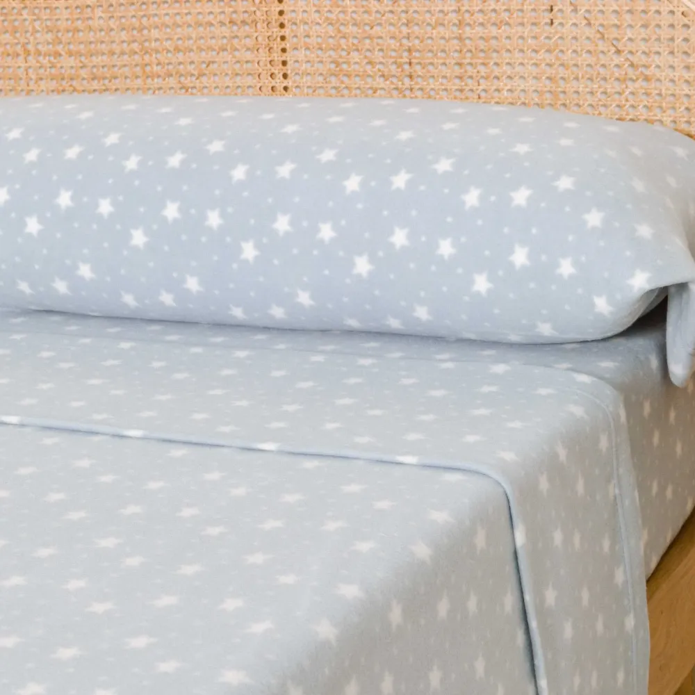 Lençóis e fronhas com estampado de pequenas estrelas e bolinhas brancas sobre um fundo azul.