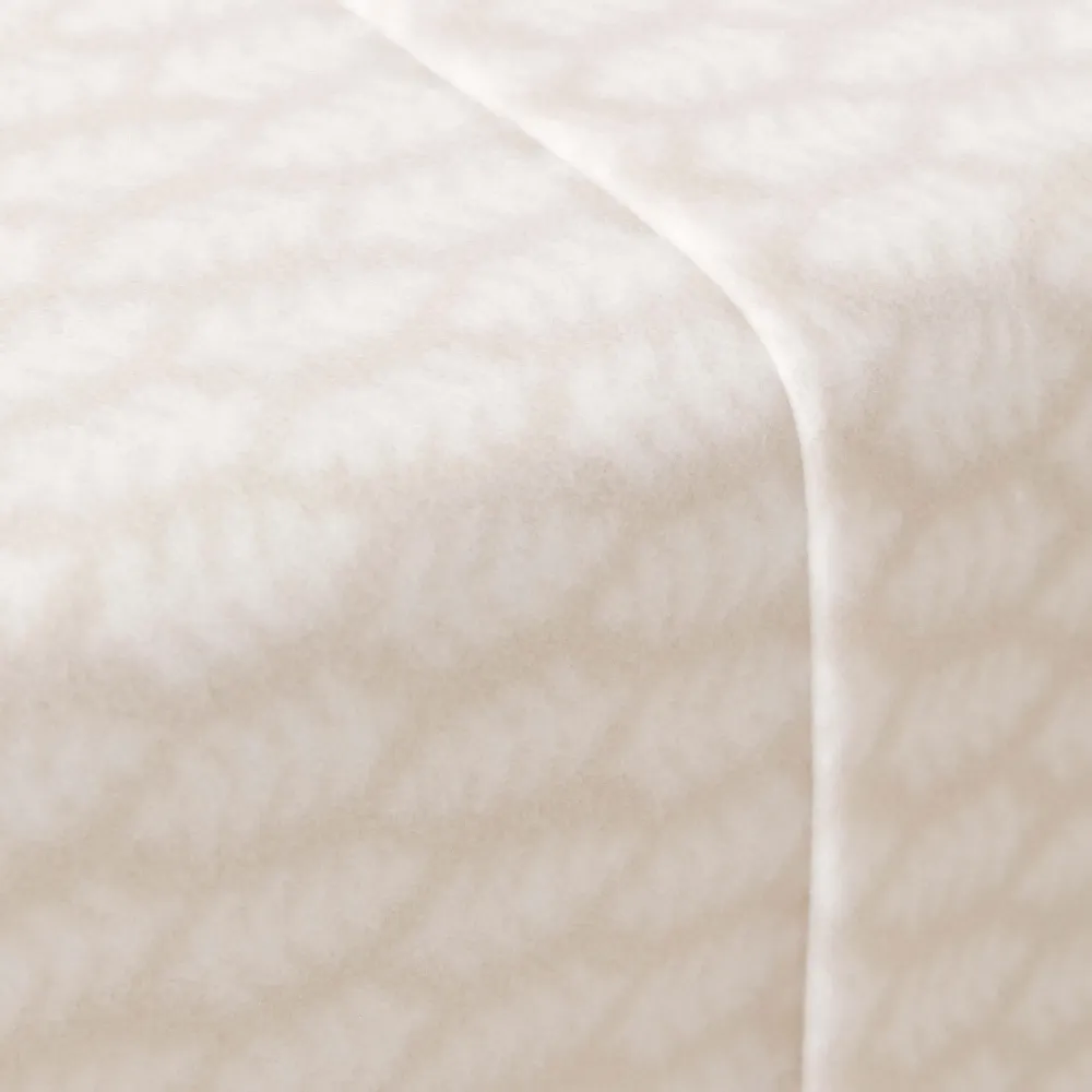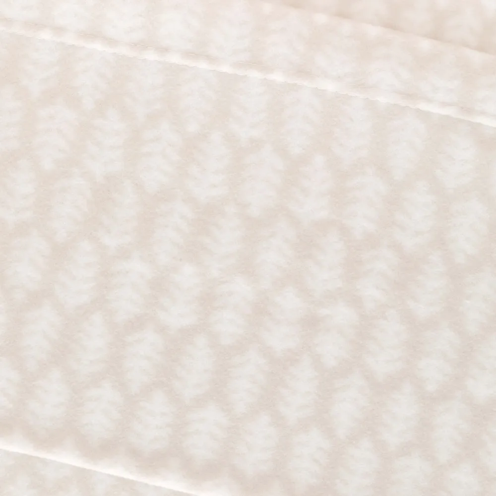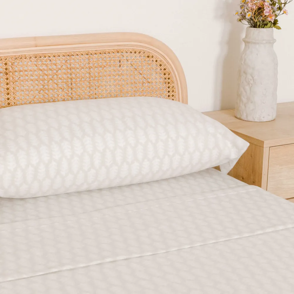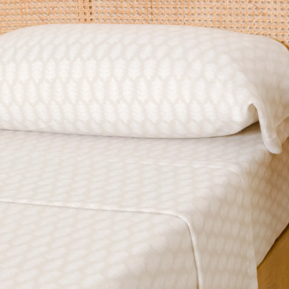 Lençóis e fronhas com estampado de folhas brancas sobre um fundo bege.