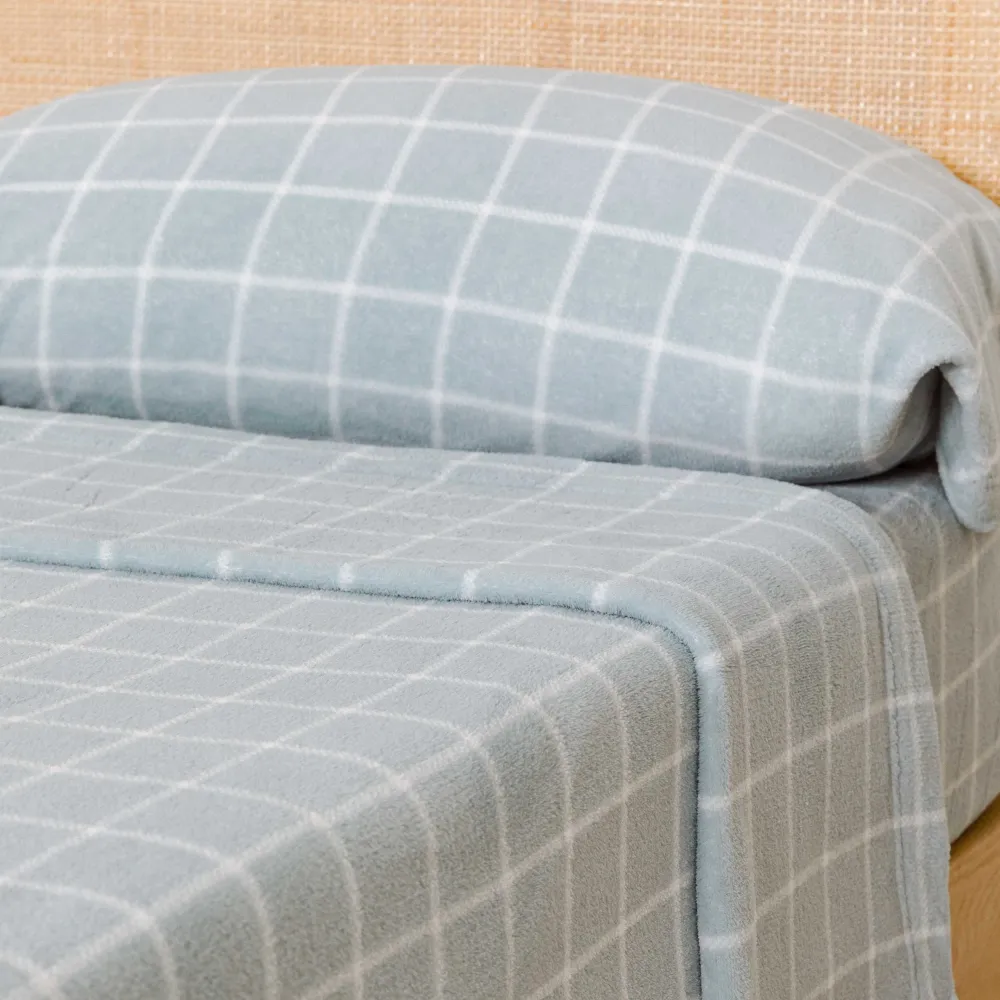 Lençóis e fronha com estampa clássica de quadros brancos sobre um fundo azul.
