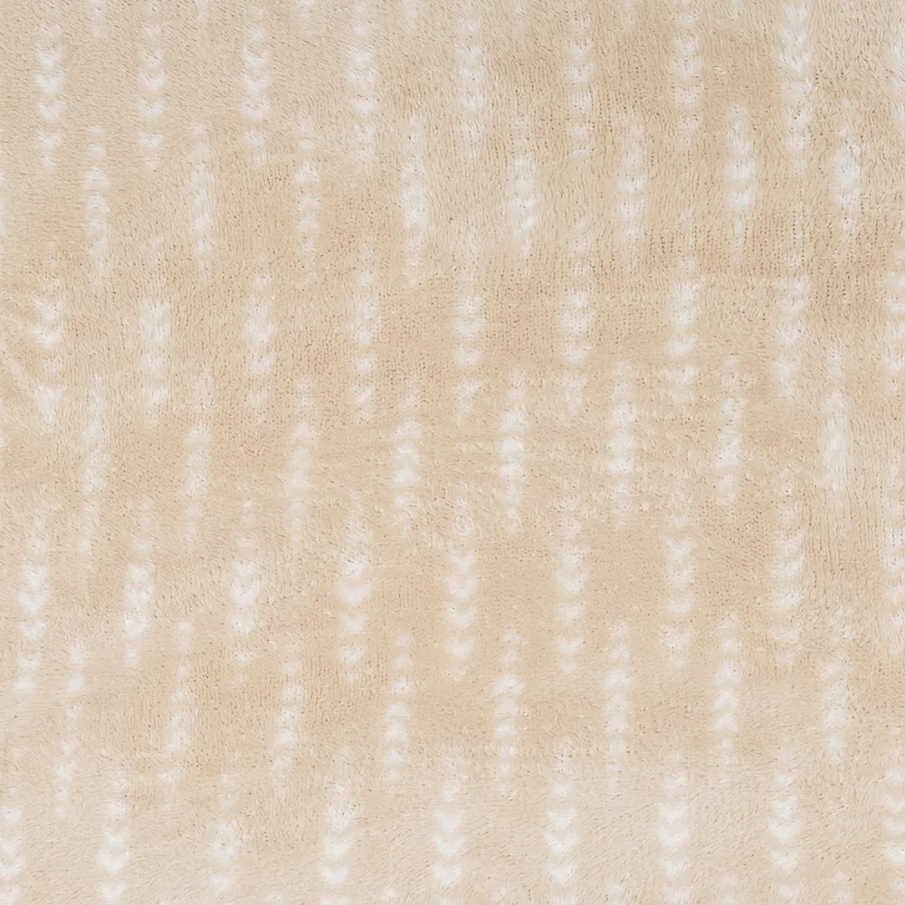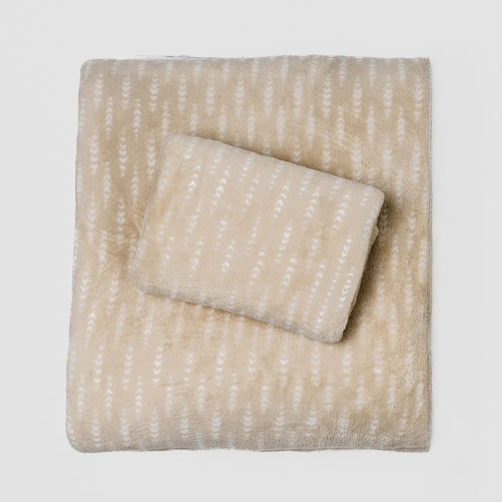 Lençóis e fronhas com estampado de pequenas espigas brancas sobre um fundo cor de areia.