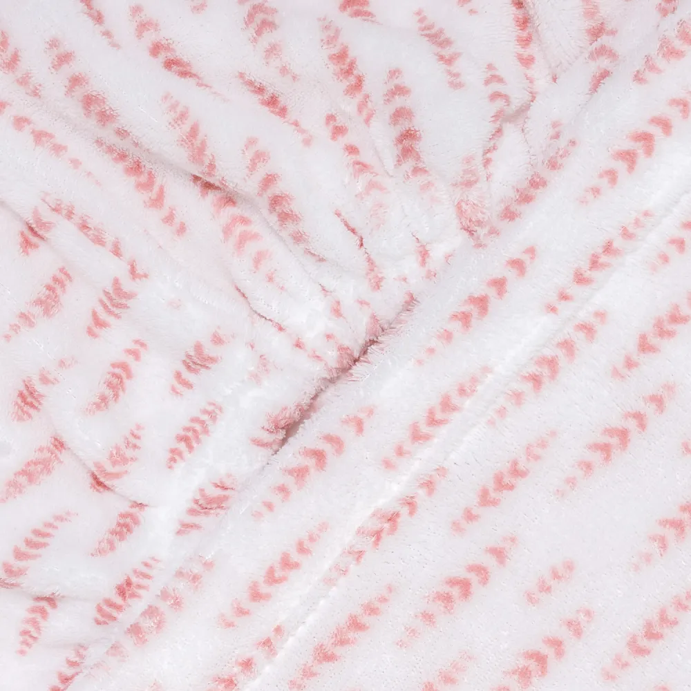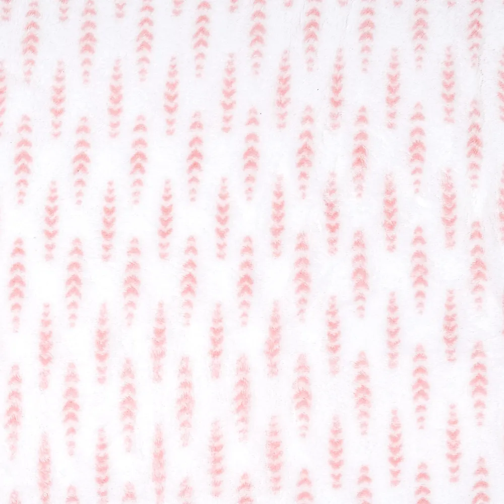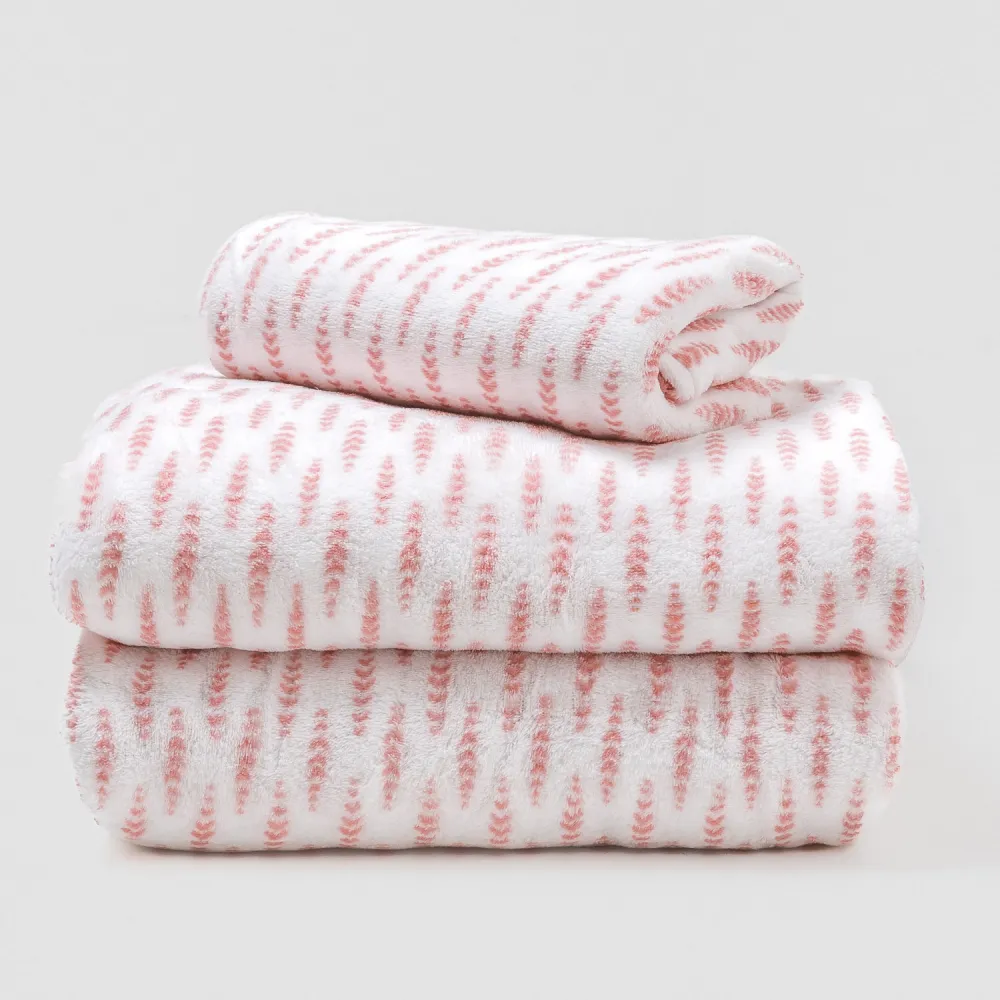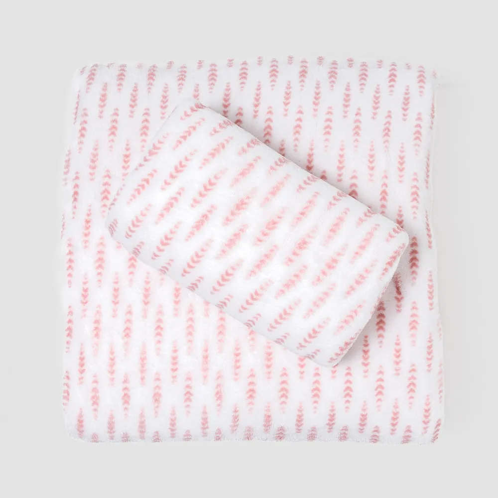 Lençóis e fronhas com estampado de pequenas espigas rosa sobre um fundo branco.
