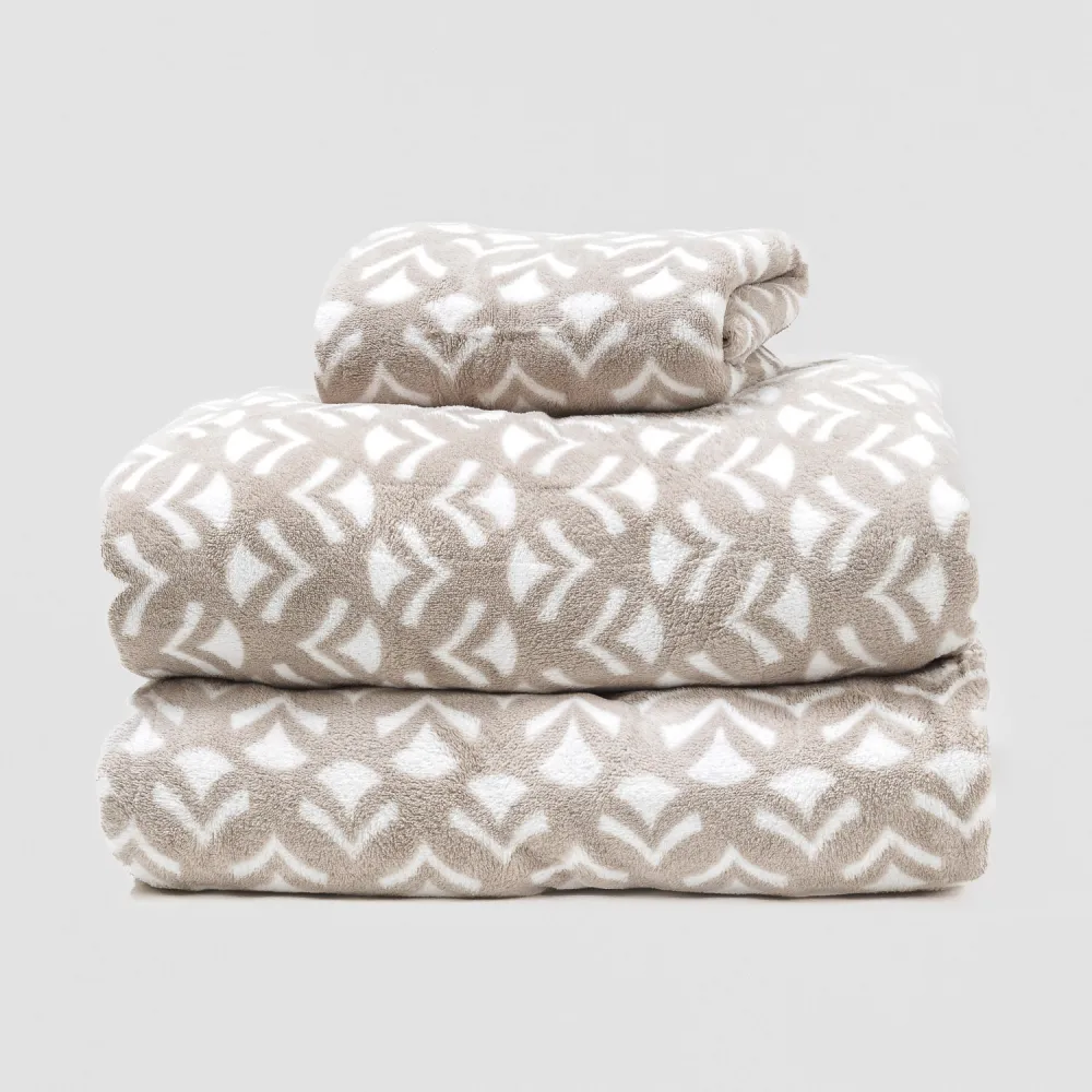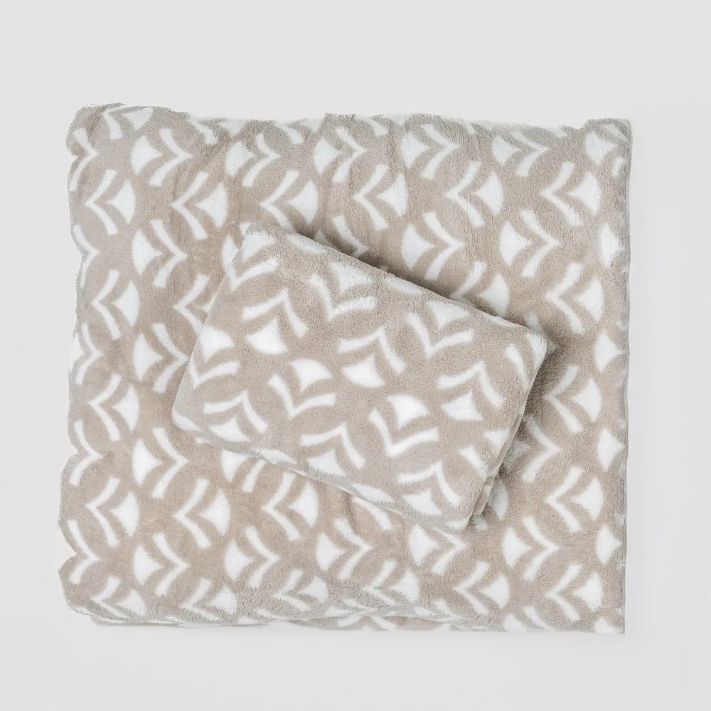 Lençóis e fronhas com estampado de figuras brancas sobre um fundo cinzento claro.