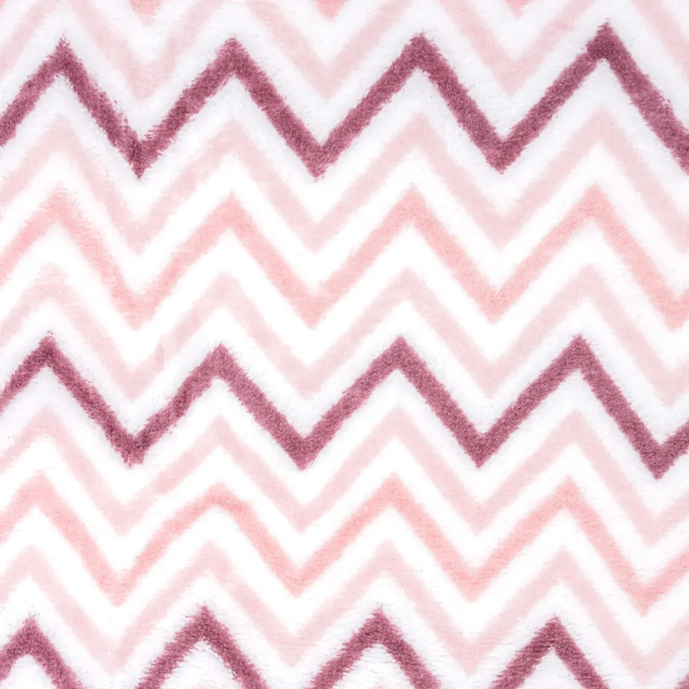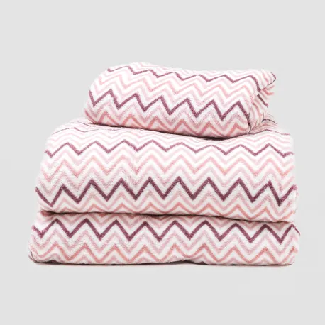 Lençóis e fronhas com estampado de ziguezagues em diferentes tons de rosa sobre um fundo branco.