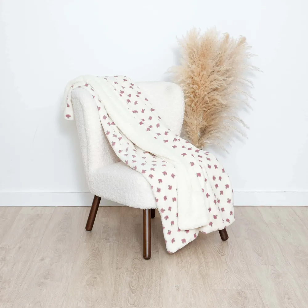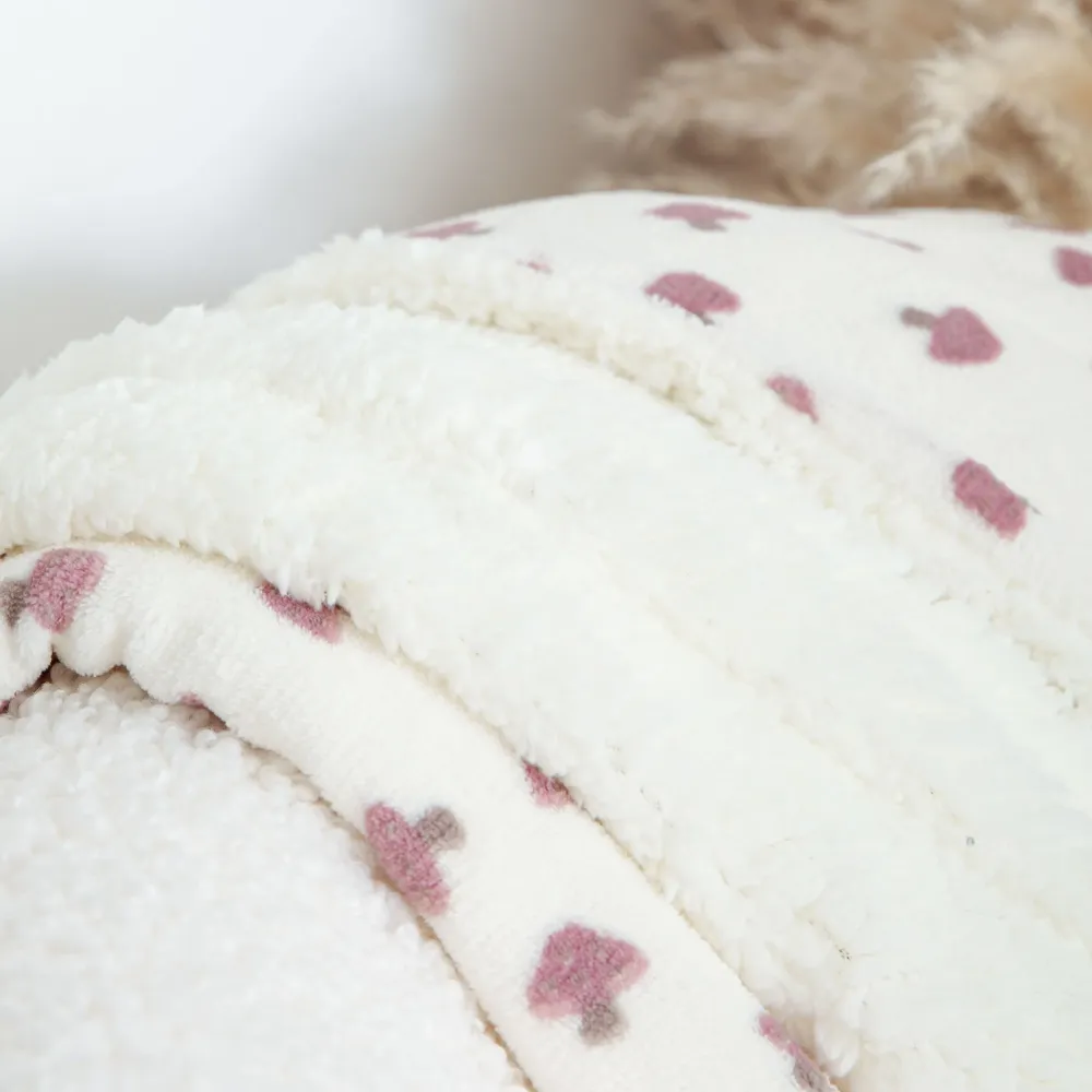 Caracteriza-se por ter duas faces com texturas diferentes: uma mais macia de coralina com estampa de cogumelos rosa e castanhos sobre um fundo branco, e outra mais quente e fofinha que imita a lã de carneirinho na cor creme.