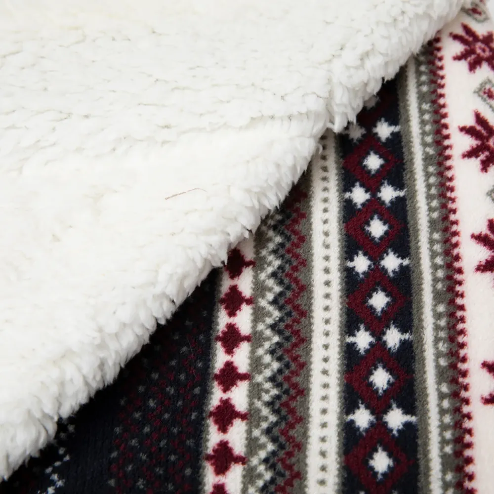 Caracteriza-se por ter duas faces com texturas diferentes: uma mais macia de coralina com estampa étnica em tons de vermelho, branco e cinza sobre um fundo azul marinho, e outra mais quente e fofinha que imita a lã de carneirinho na cor creme.