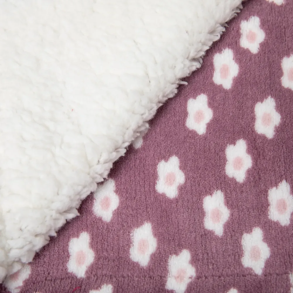 Caracteriza-se por ter duas faces com texturas diferentes: uma mais macia de coralina com estampa de flores brancas sobre um fundo beringela, e outra mais quente e fofinha que imita a lã de carneirinho na cor creme.