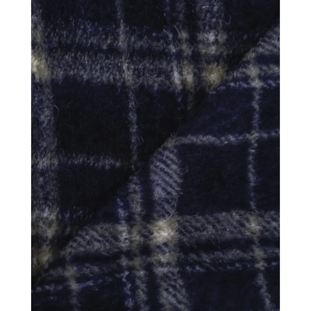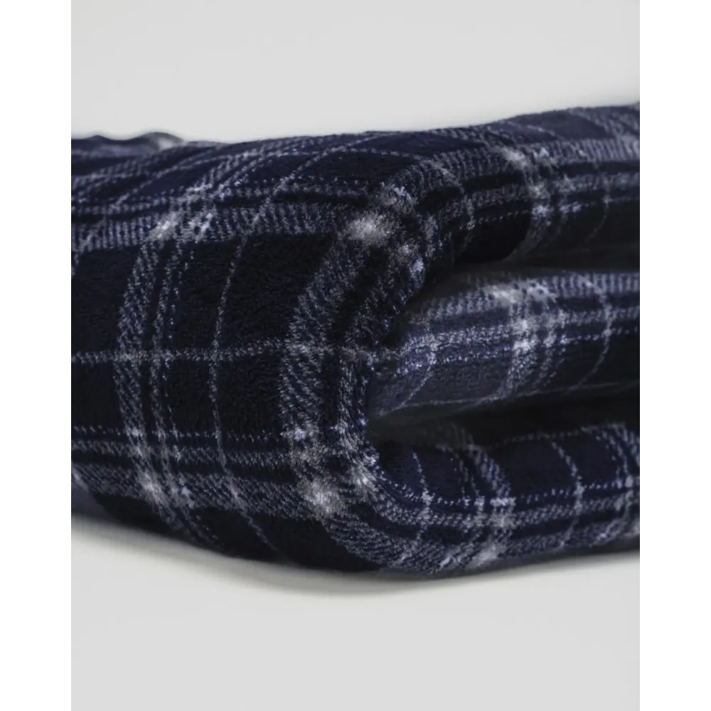 Presenta un estampado de cuadros y rayas en tonos grises sobre un fondo azul marino en tejido coralina.