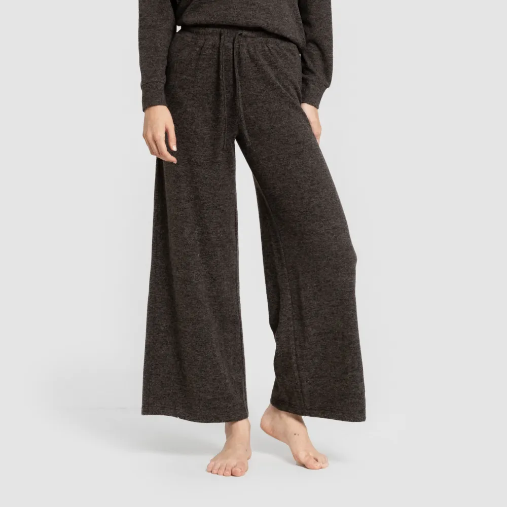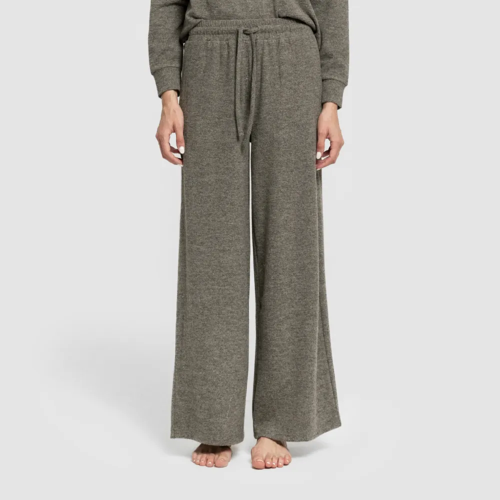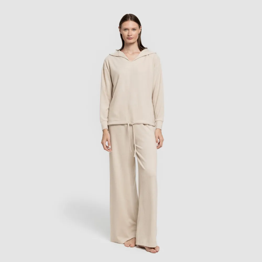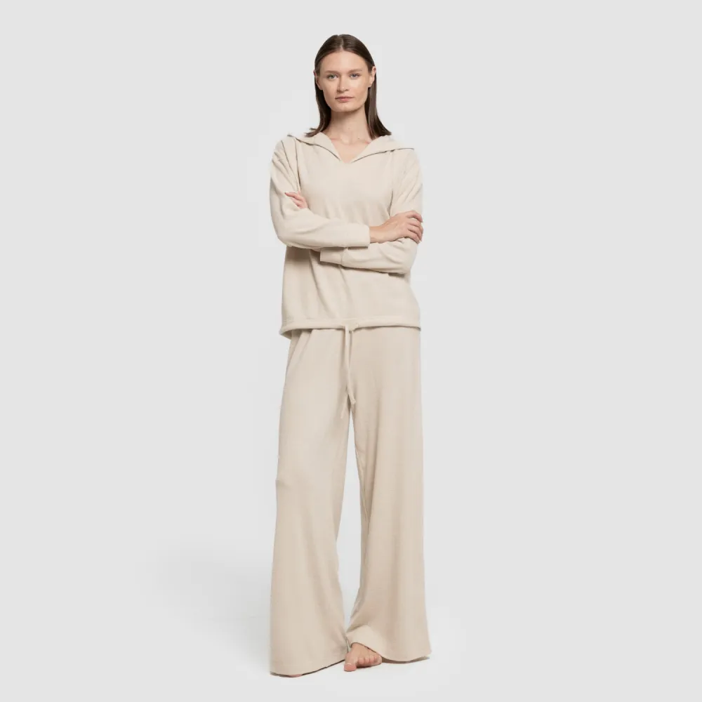 Calças compridas de corte largo e fluido, com bainha ligeiramente evasé e cintura elástica com fita ajustável.