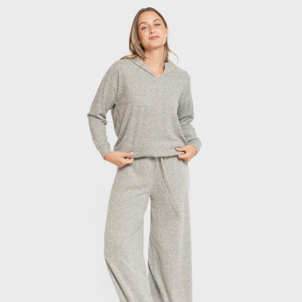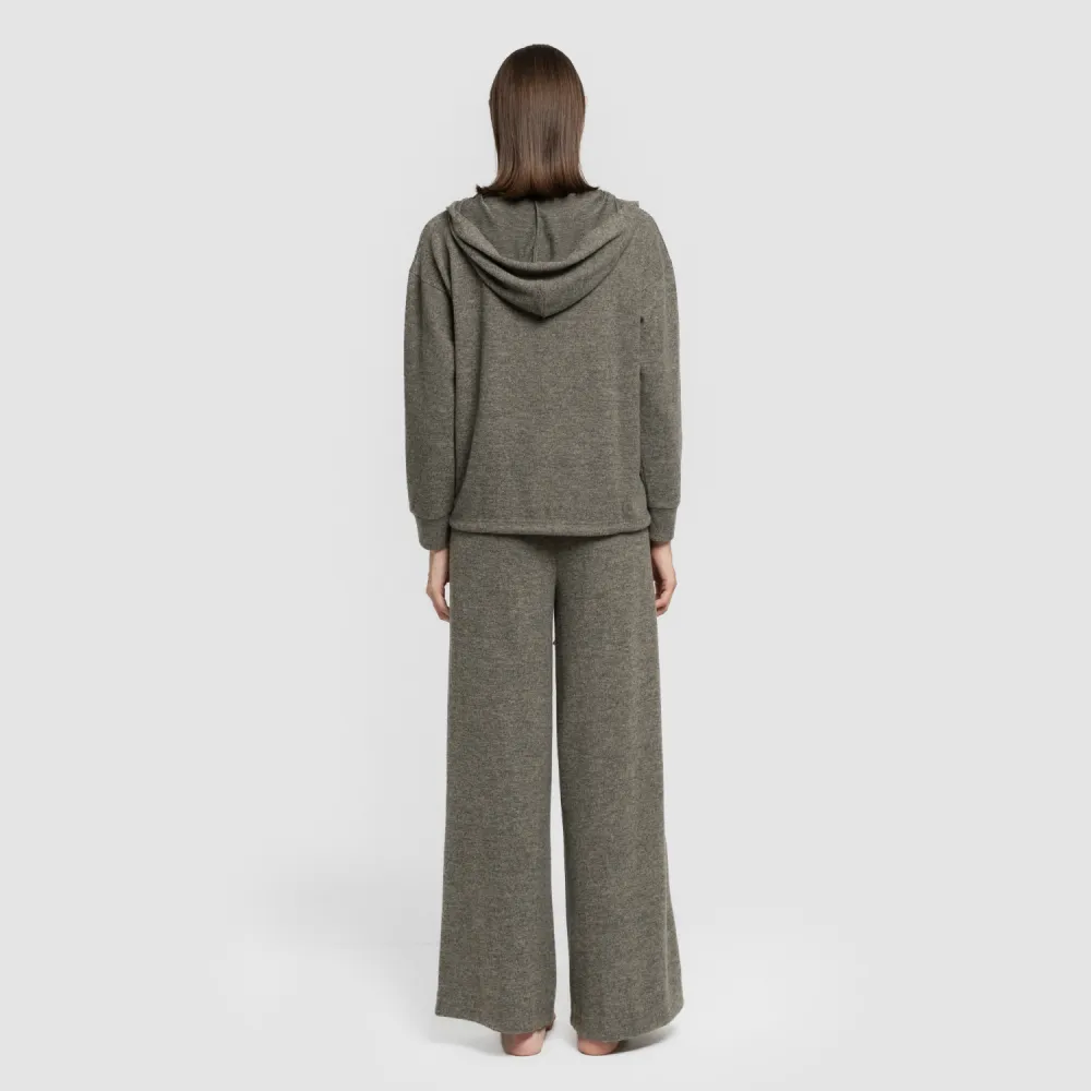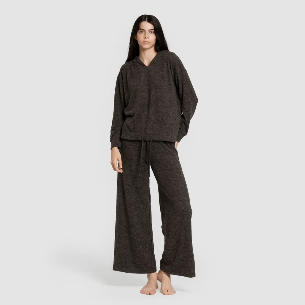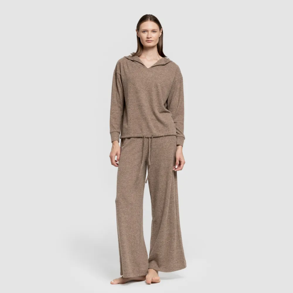 Calças compridas de corte largo e fluido, com bainha ligeiramente evasé e cintura elástica com fita ajustável.