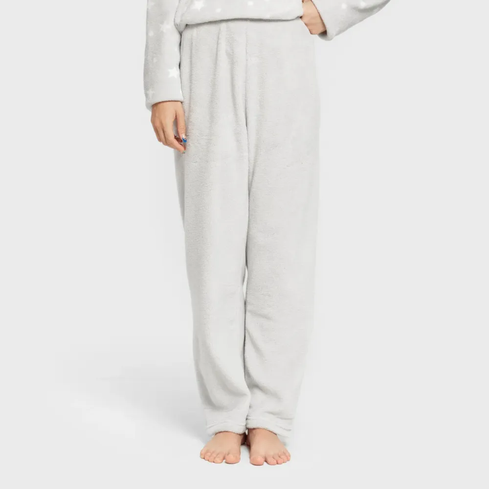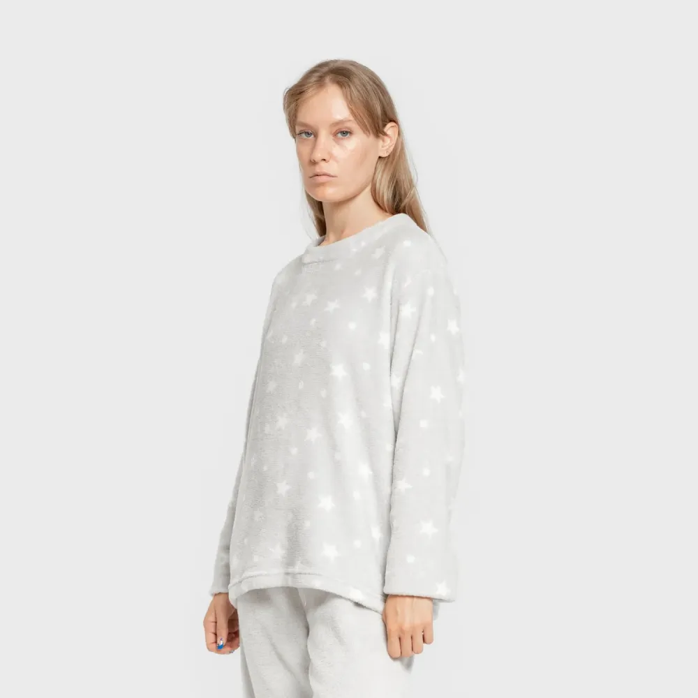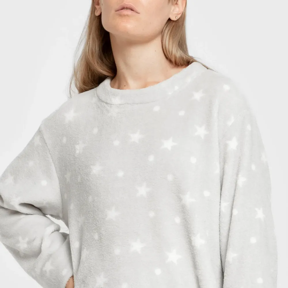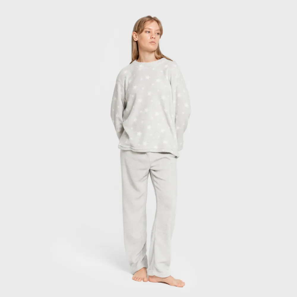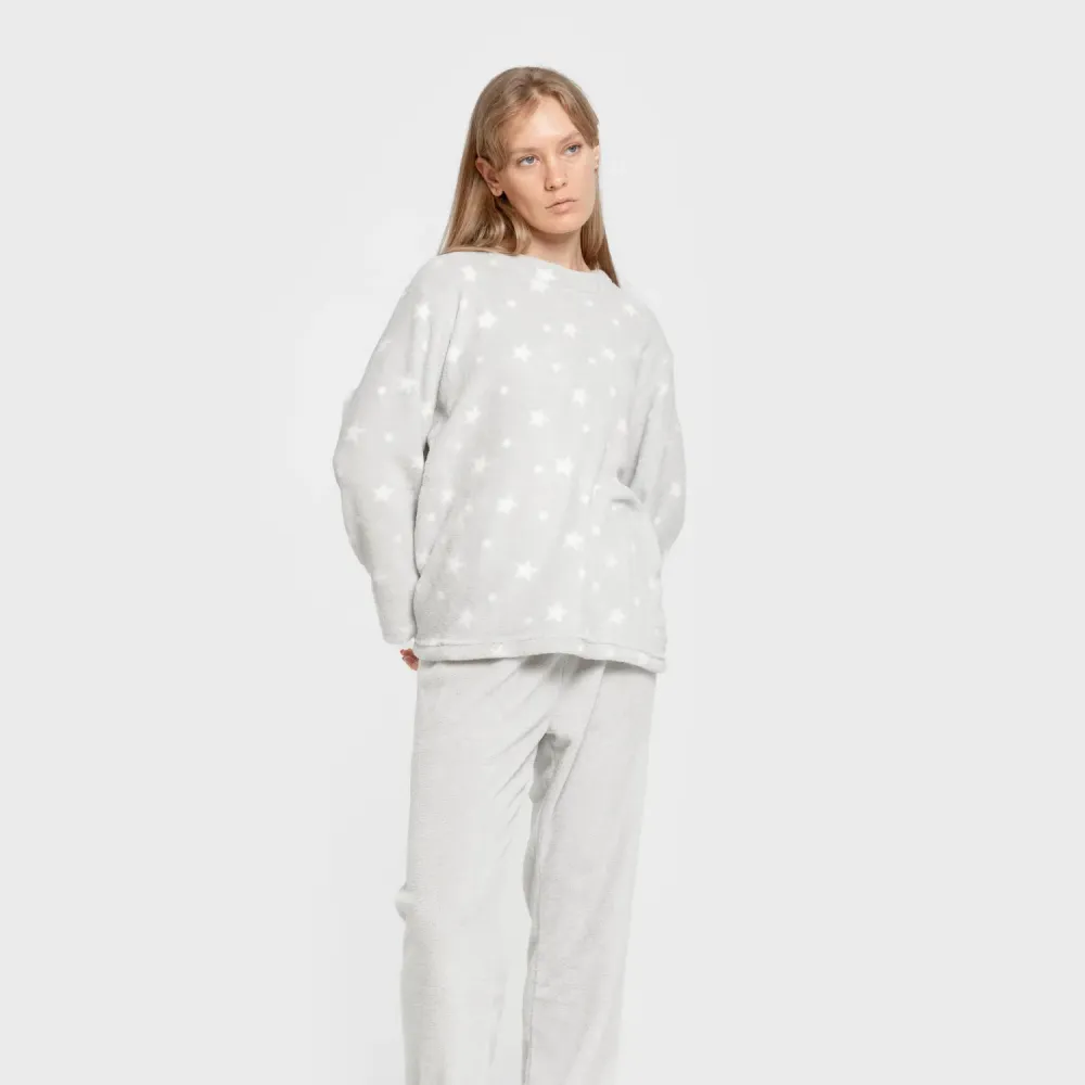 O pijama inclui uma camiseta cinza com estrelas e bolinhas brancas, e uma calça lisa na cor pérola.