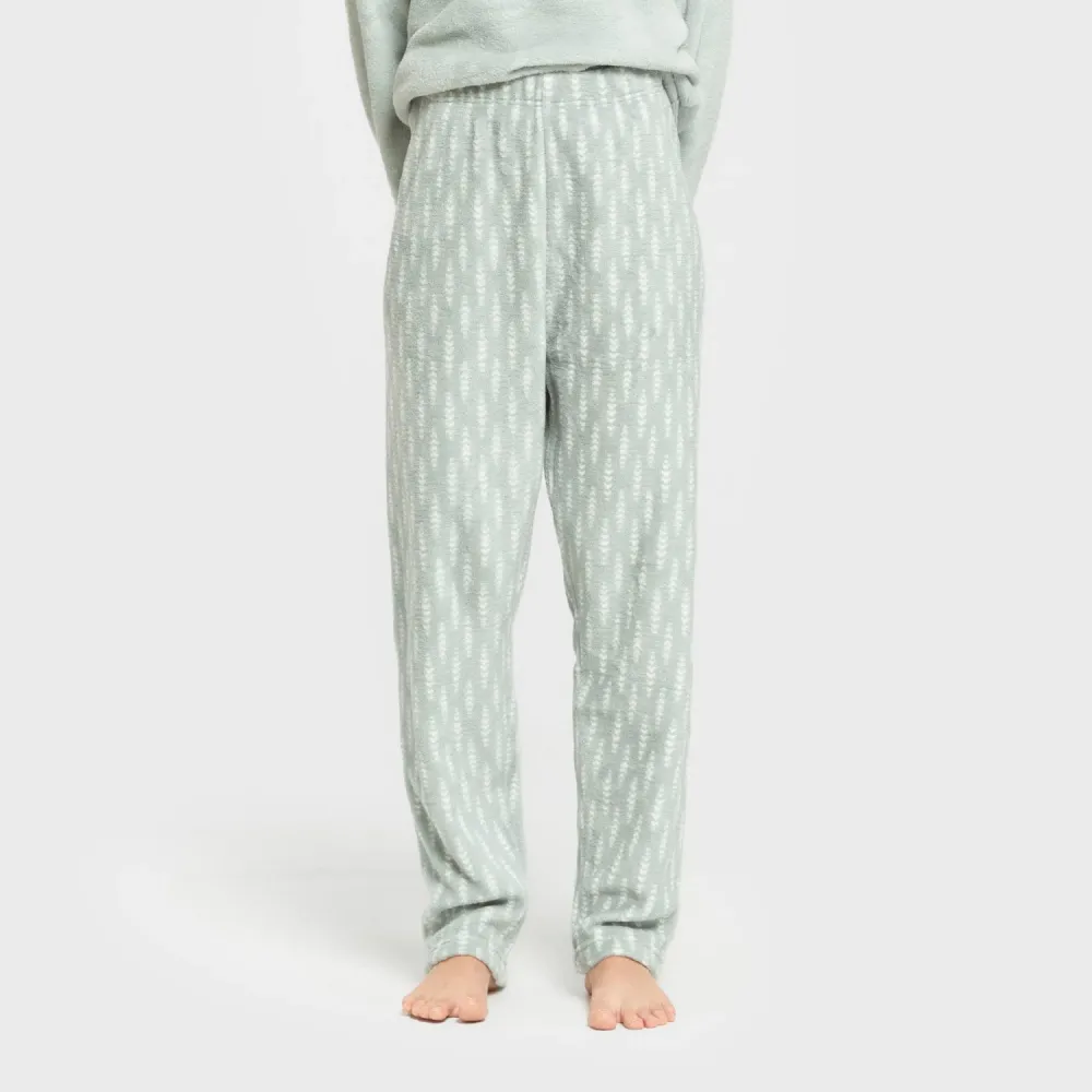 O pijama inclui uma camiseta lisa na cor verde tiffany e uma calça no mesmo tom com estampa de espigas brancas.