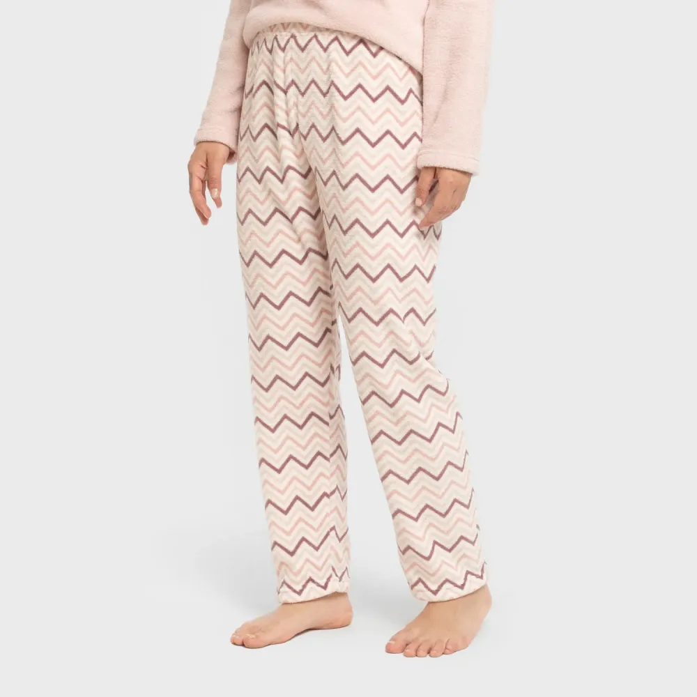 O pijama inclui uma camiseta lisa na cor rosa e uma calça branca com estampa de zigue-zagues em diferentes tons de rosa.