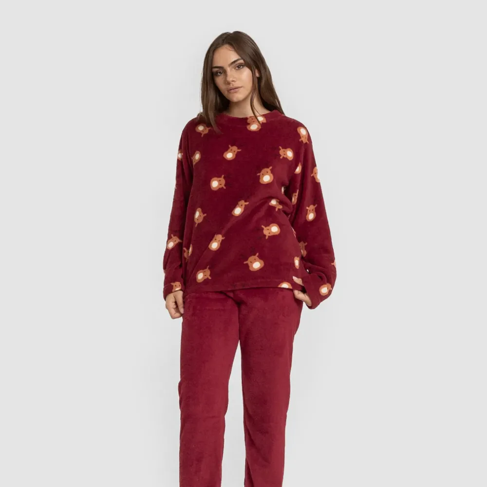 O pijama inclui uma camiseta bordô com estampa de renas marrons e uma calça lisa na cor vermelha.