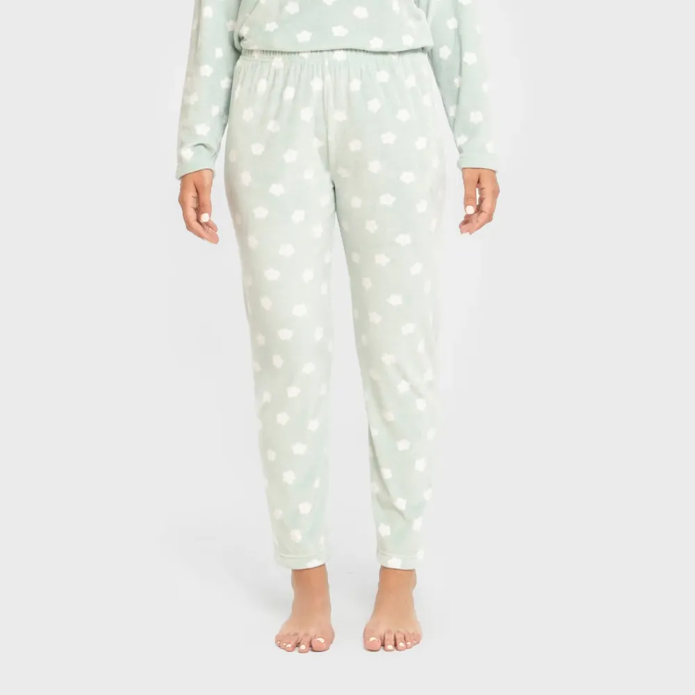 O pijama inclui uma camiseta e uma calça verde com estampa de flores brancas.