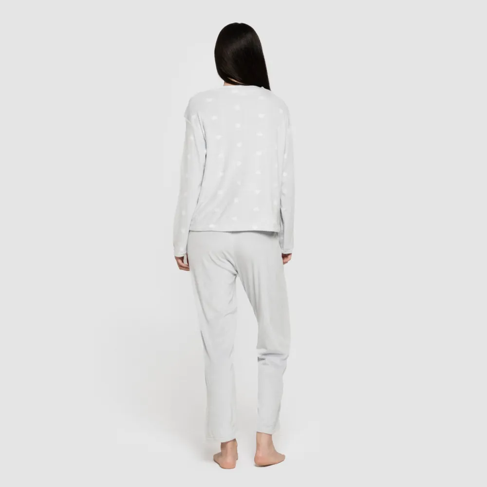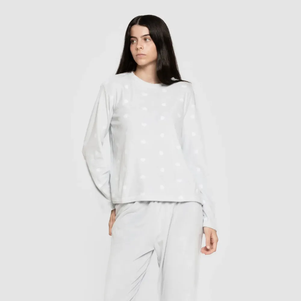 O pijama inclui uma camiseta azul com estampa de corações brancos e uma calça lisa azul-celeste.