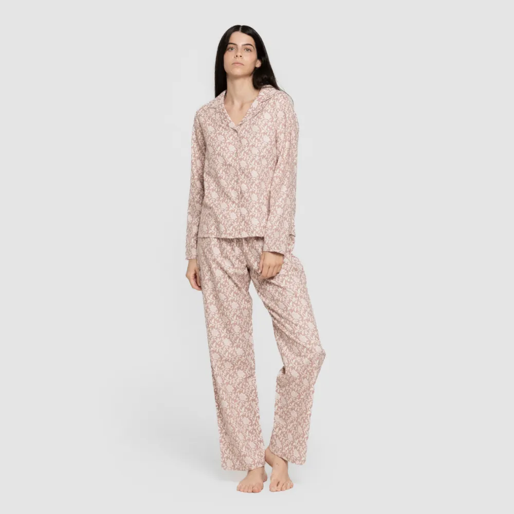 O pijama inclui uma camisa de manga comprida com gola e botões e umas calças compridas com elástico revestido e cordão de ajuste.