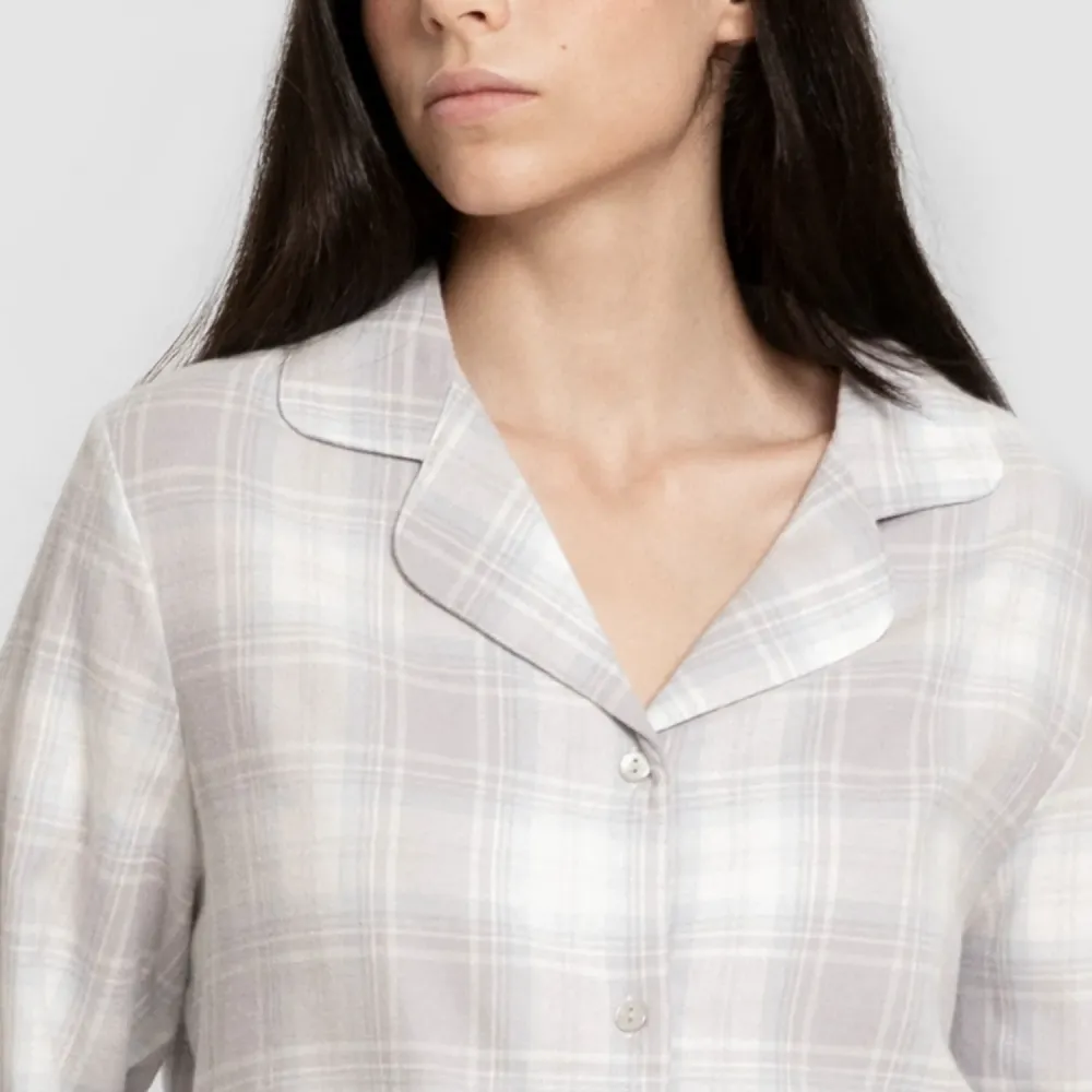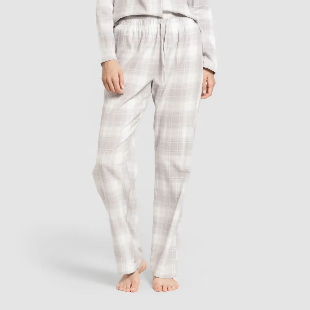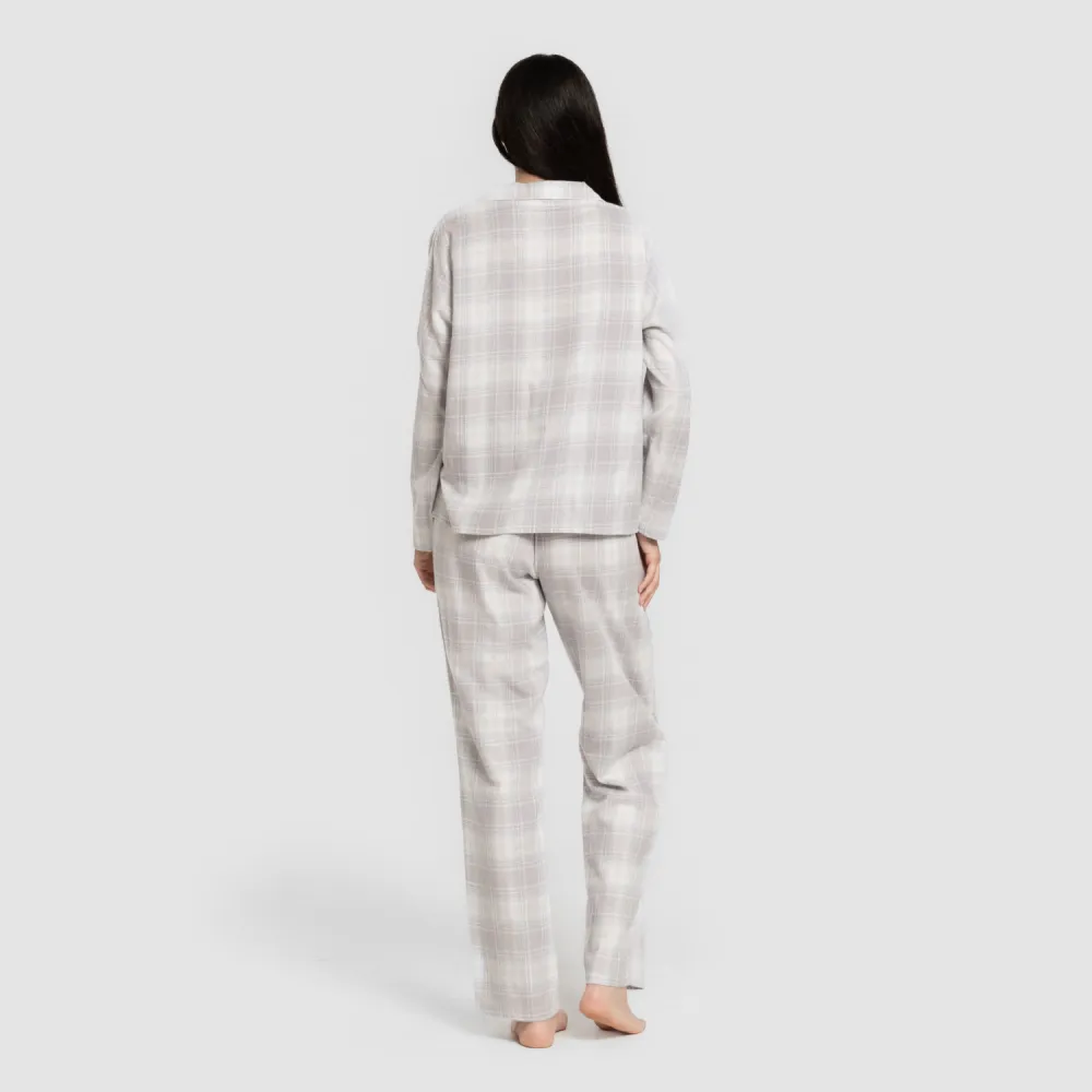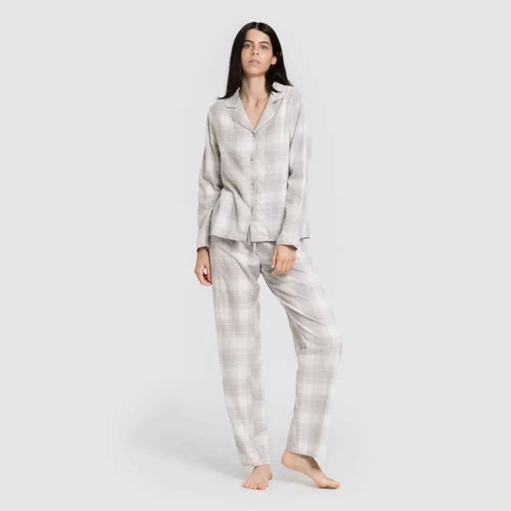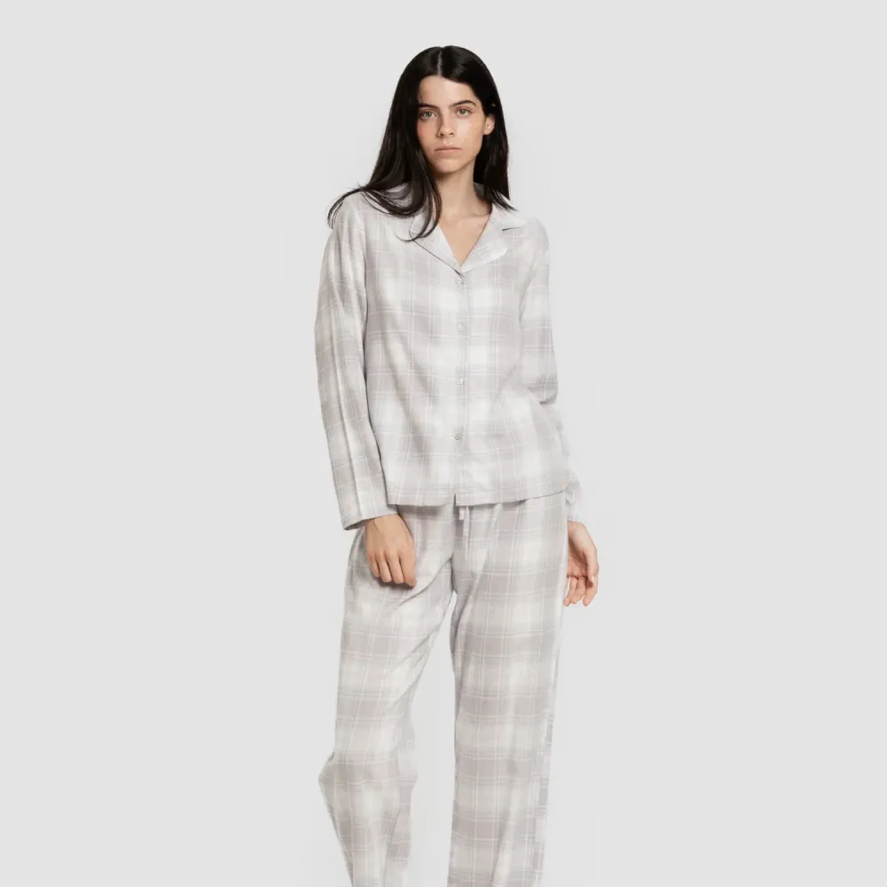Pijama clássico de flanela com camisa de manga comprida com botões e calça comprida.