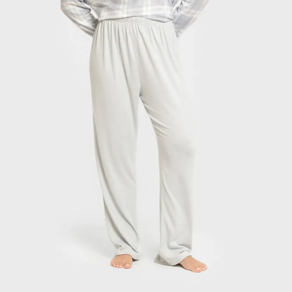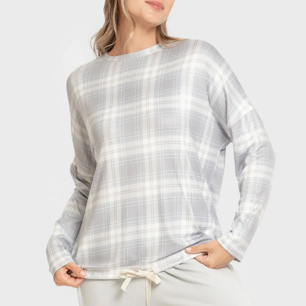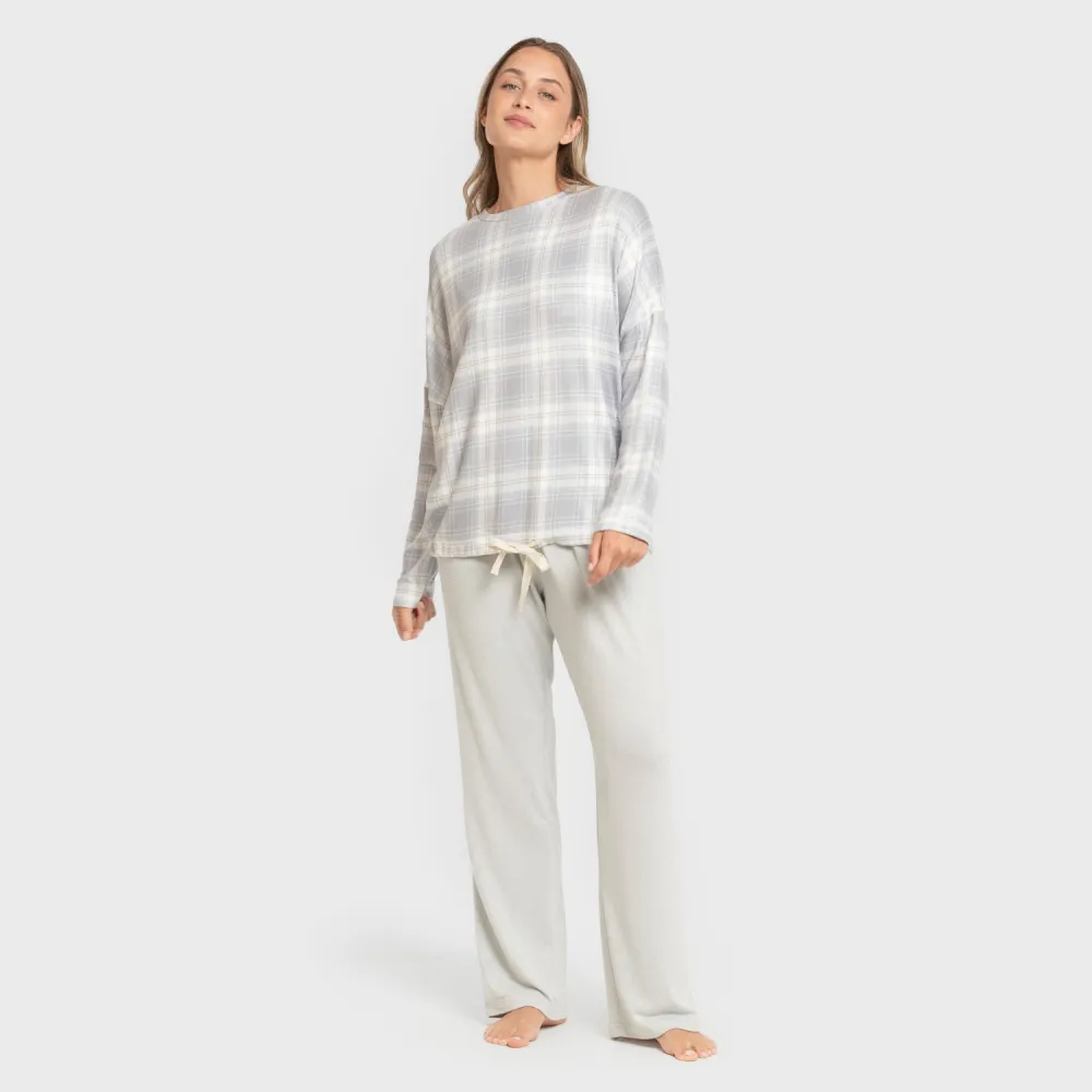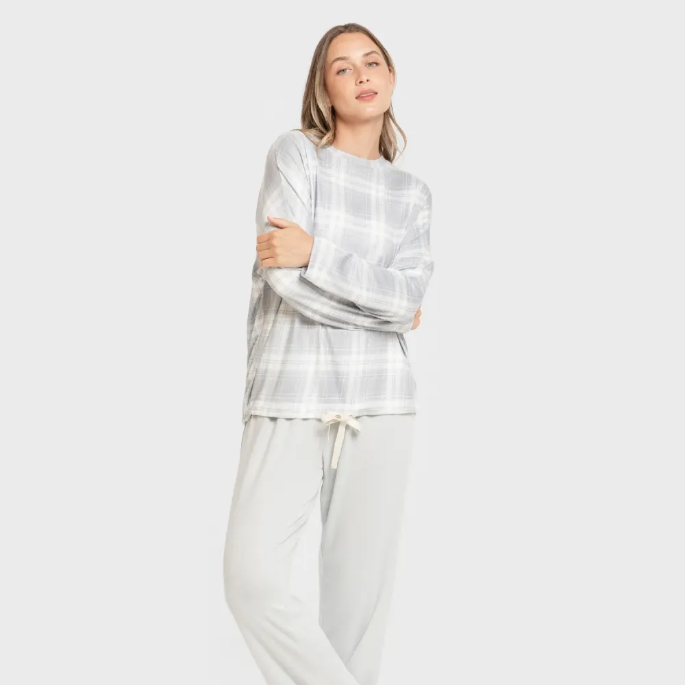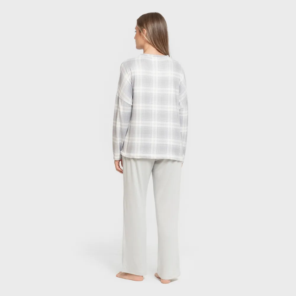 O pijama é composto por uma blusa xadrez branca e cinza com cordão ajustável na parte inferior e uma calça cinza lisa com cós elástico.