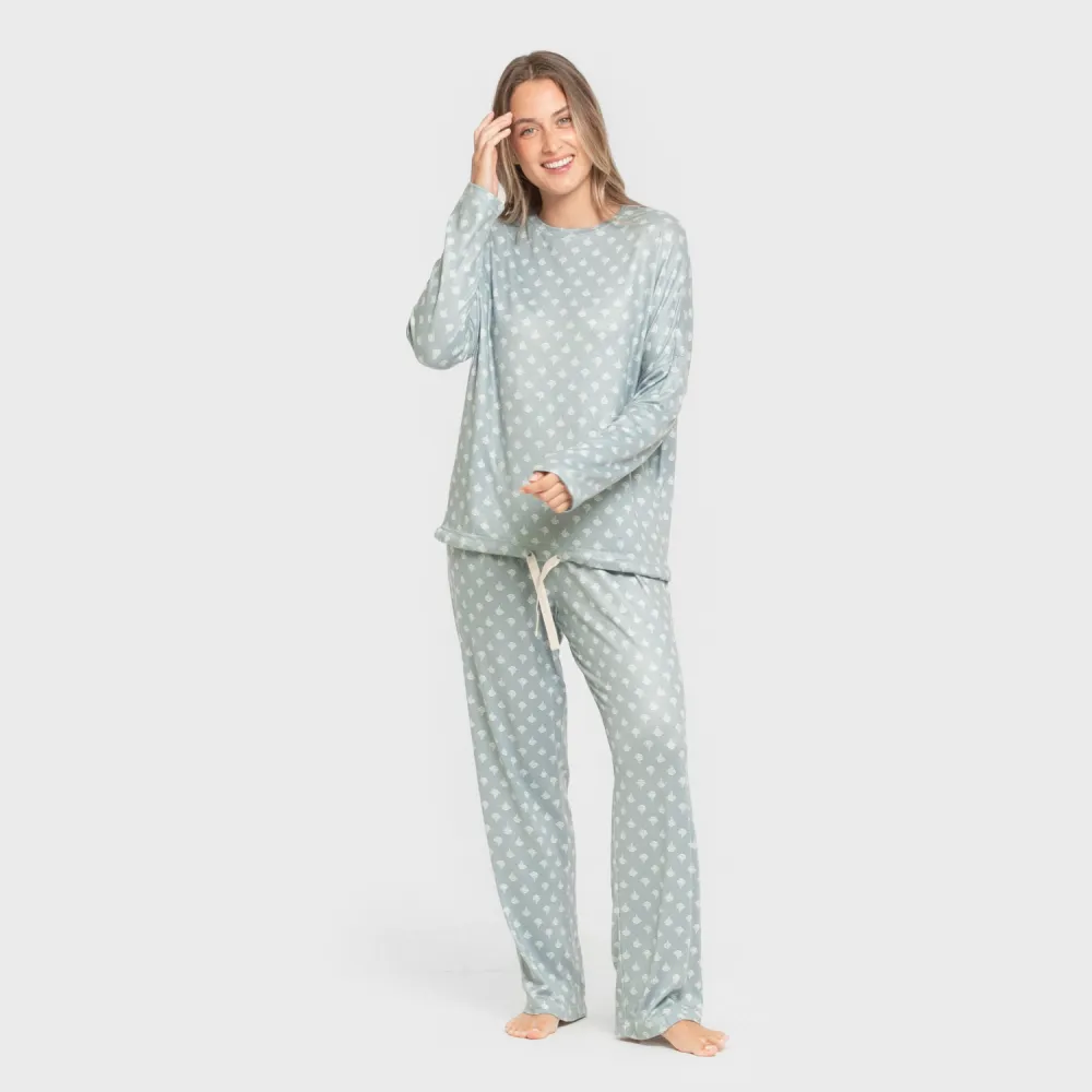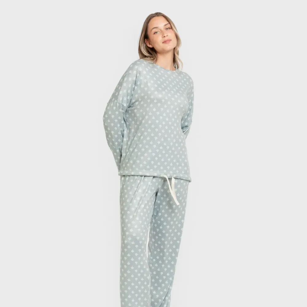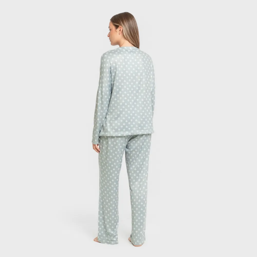 Pijama estampado de mangas e calças compridas.