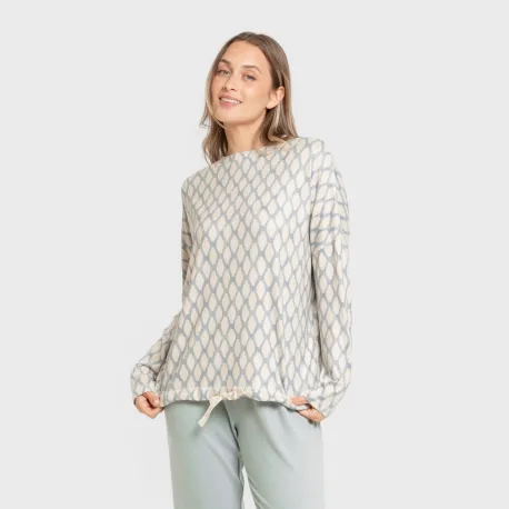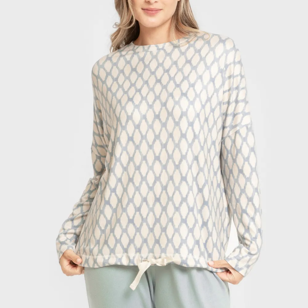 O pijama é composto por uma camiseta azul com estampa geométrica branca e cordão ajustável na parte inferior e uma calça índigo lisa com cós elástico.