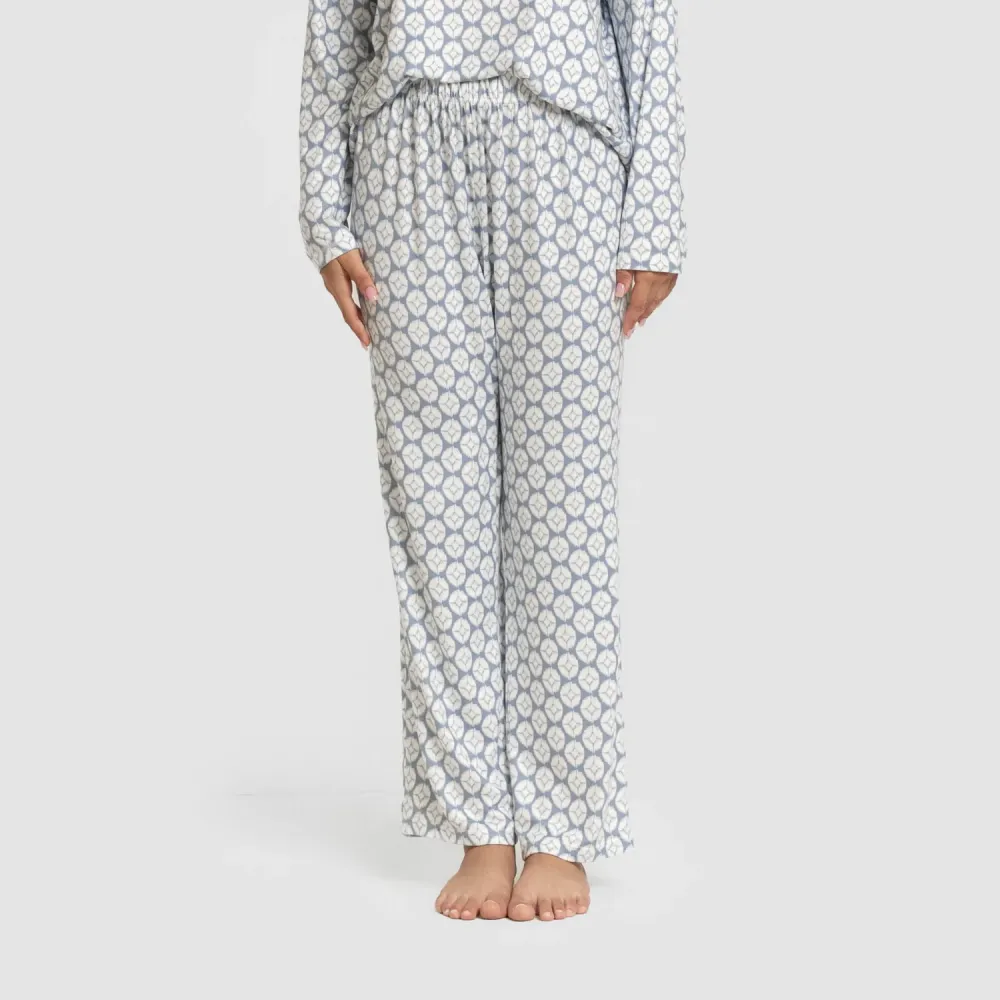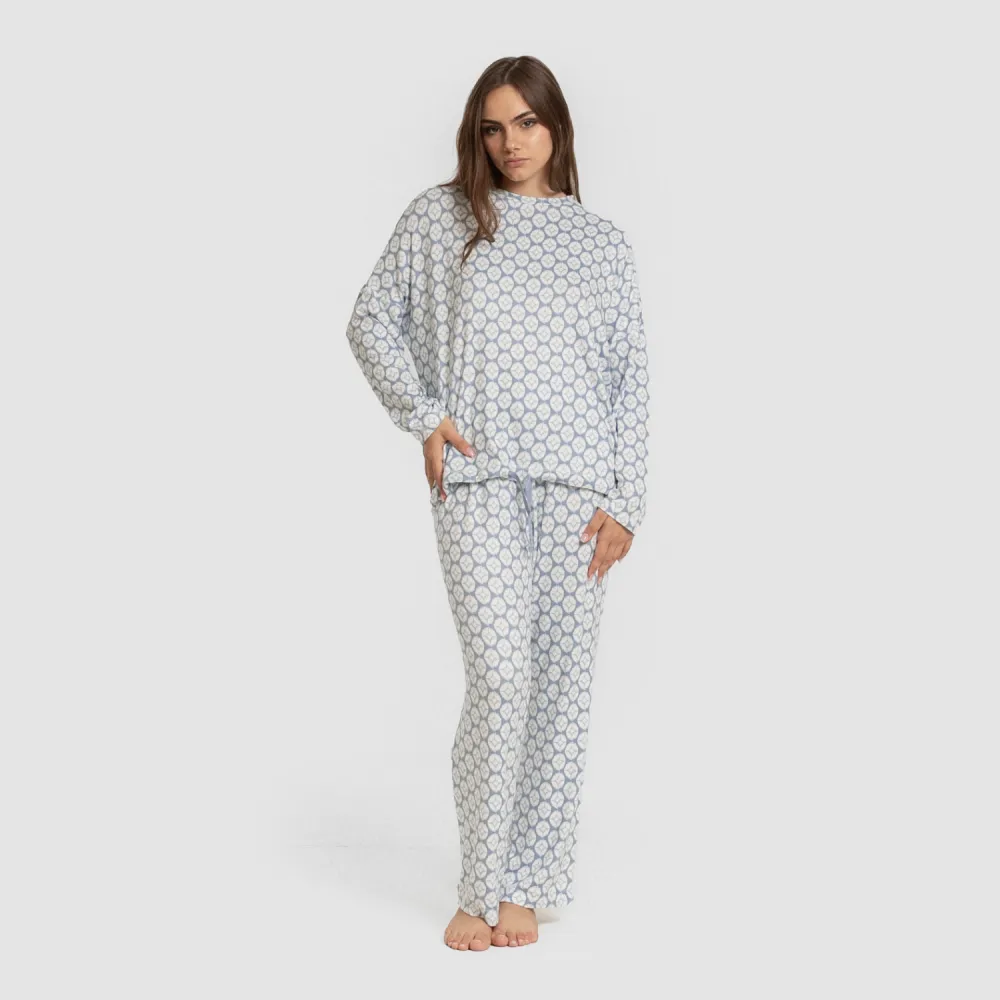 O pijama é composto por uma camiseta com cordão ajustável na parte inferior e uma calça com cintura elástica. Tanto a camiseta quanto a calça são azuis com estampa geométrica em branco.