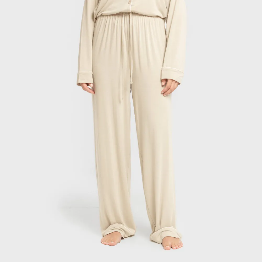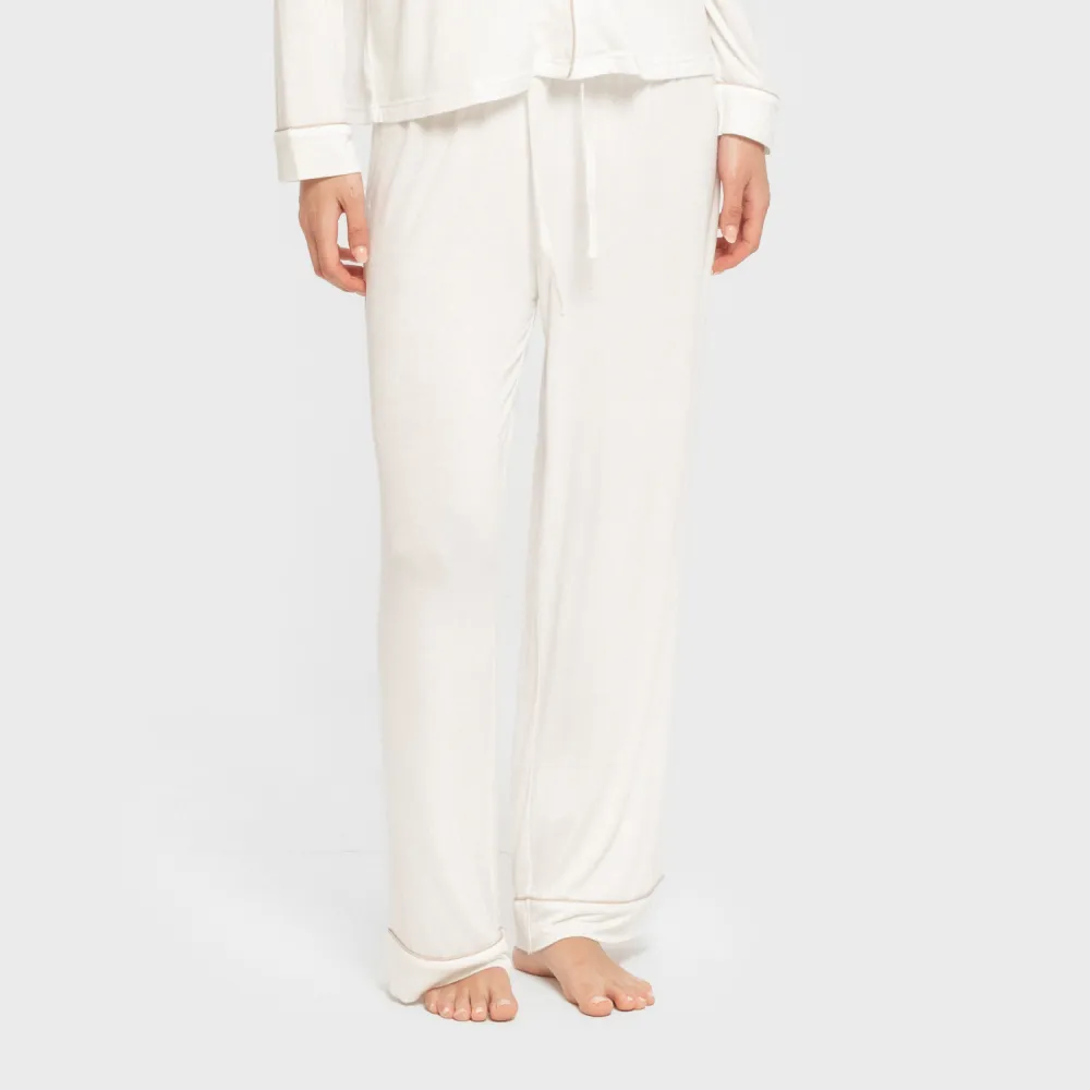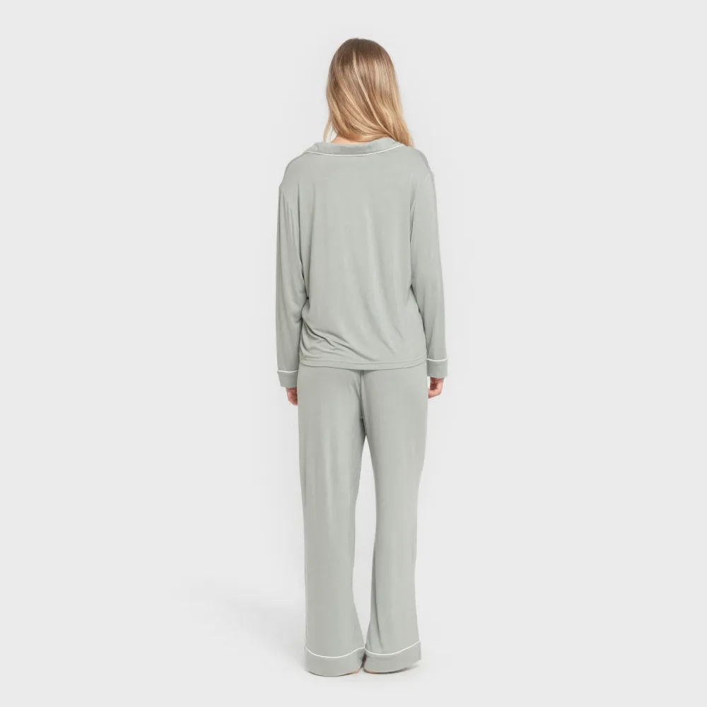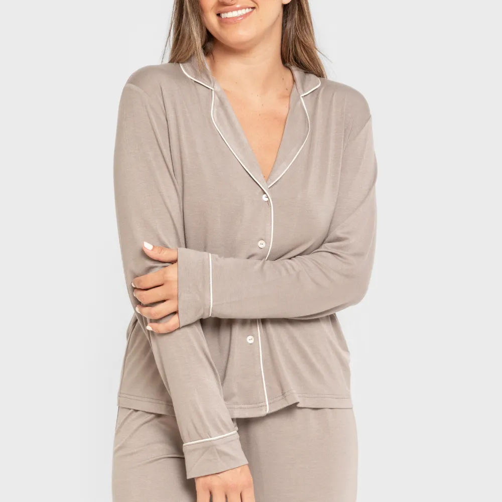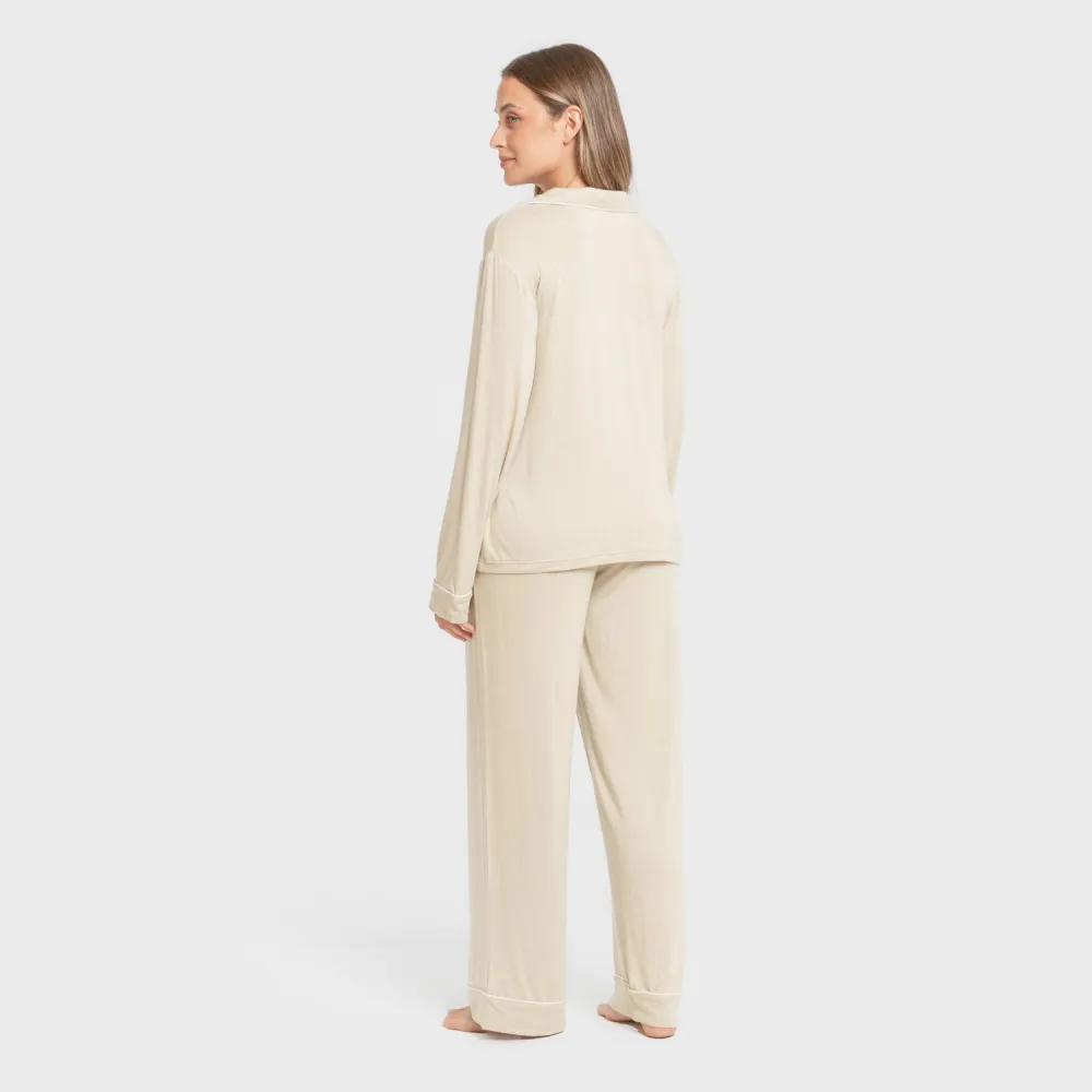 Design simples e clássico em cor lisa, composto por uma camisa de botões com gola de lapela e calça comprida fluida com cintura elástica e cordão ajustável.