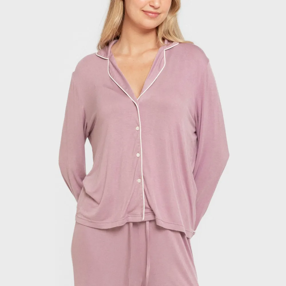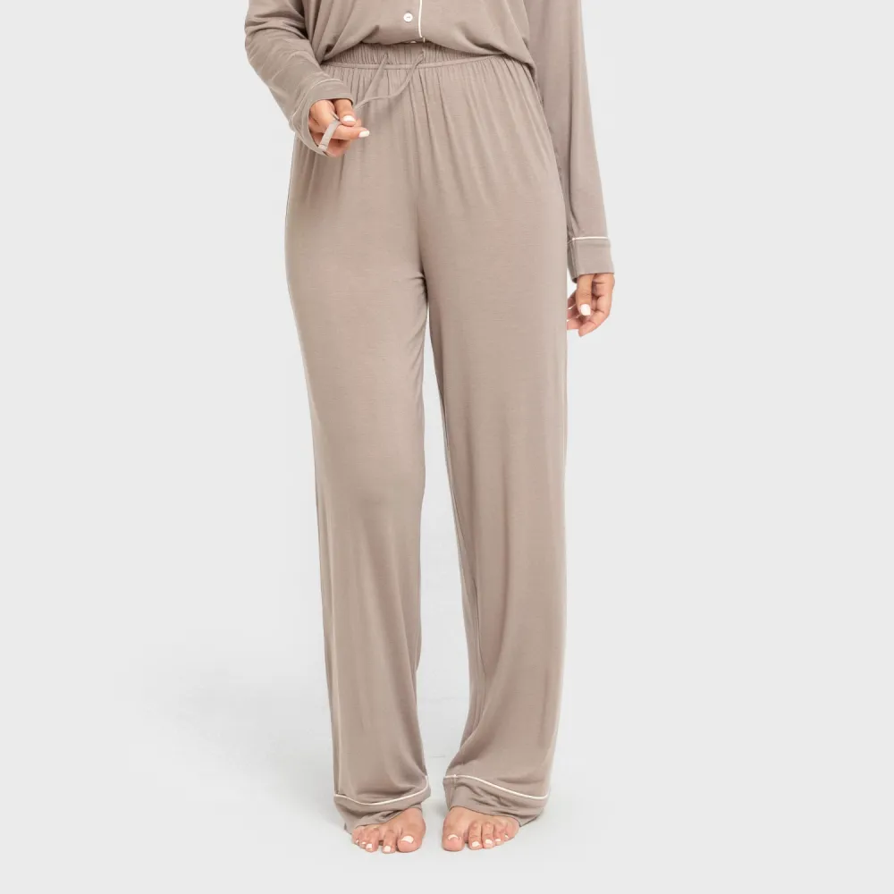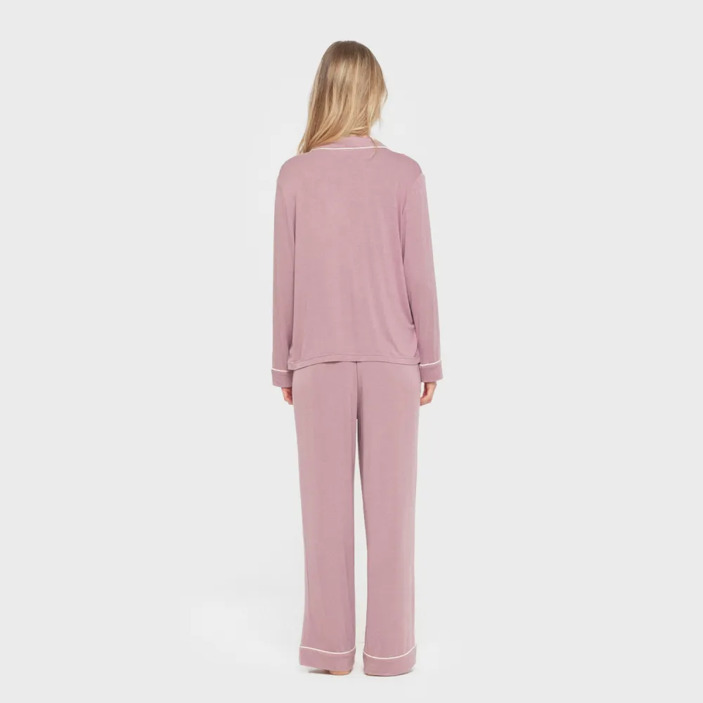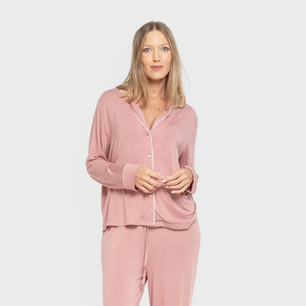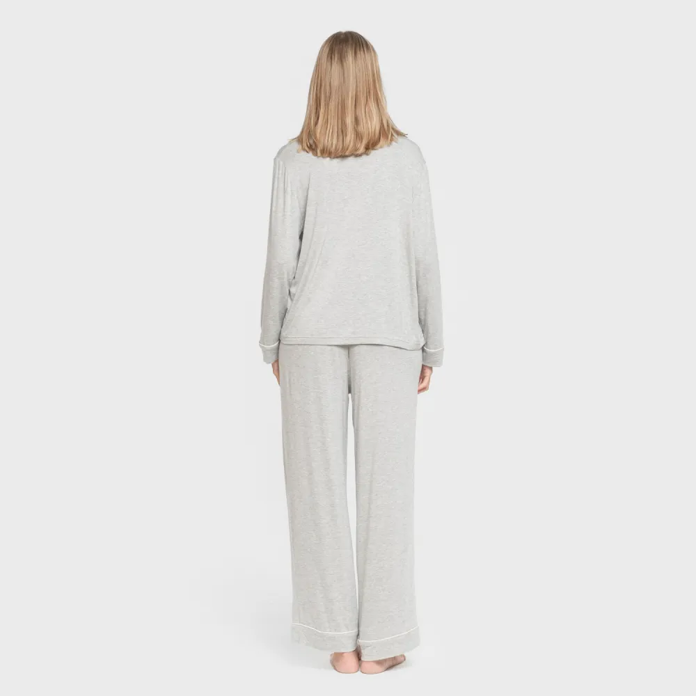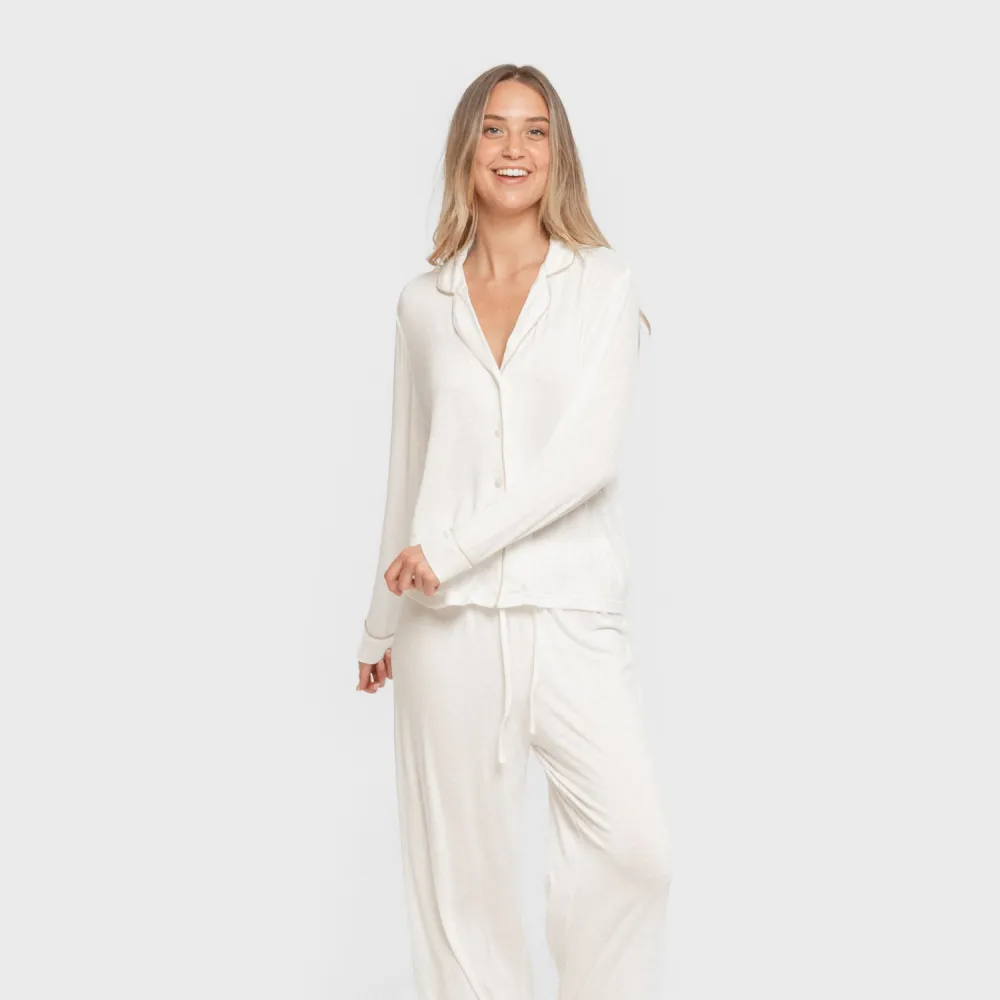 Design simples e clássico em cor lisa, composto por uma camisa de botões com gola de lapela e calça comprida fluida com cintura elástica e cordão ajustável.