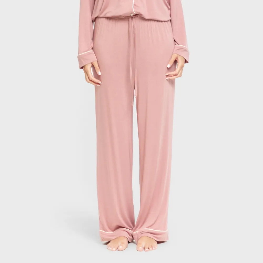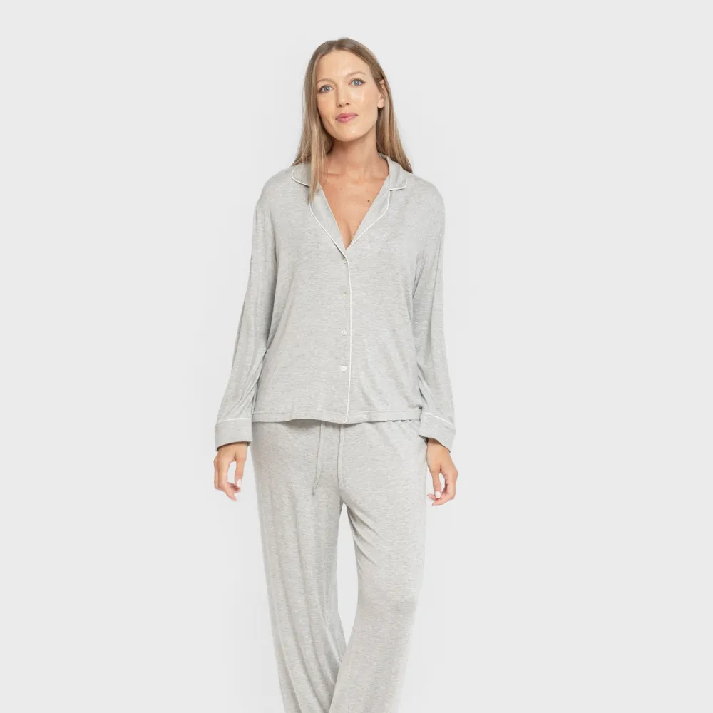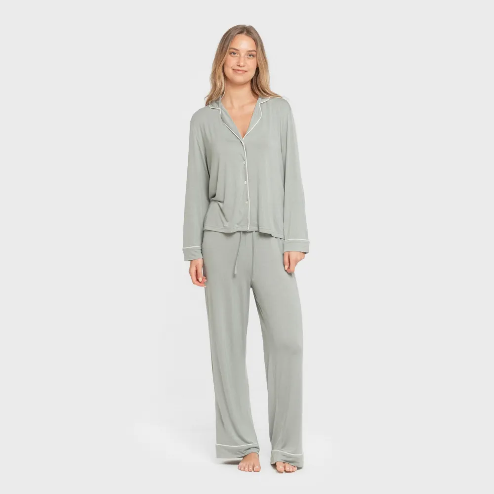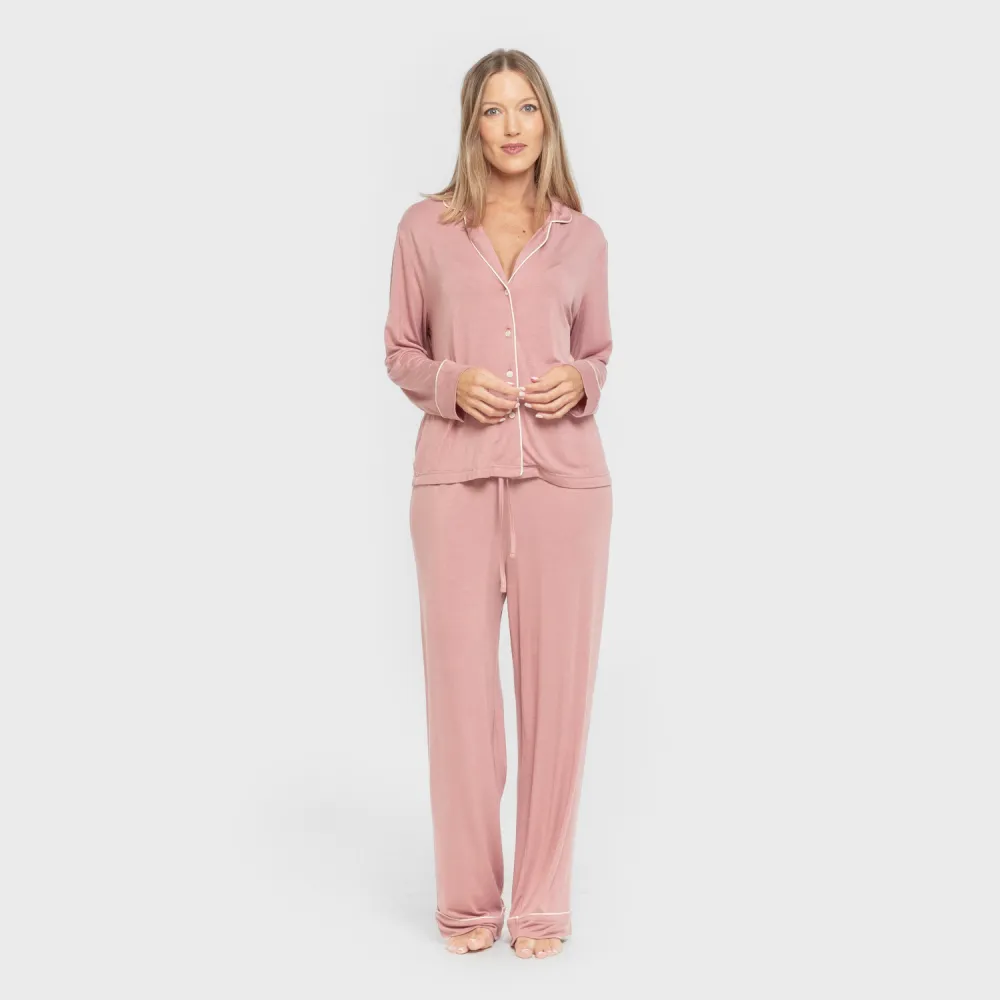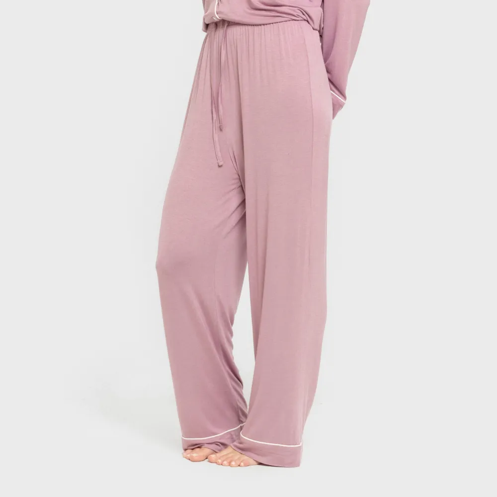 Design simples e clássico em cor lisa, composto por uma camisa de botões com gola de lapela e calça comprida fluida com cintura elástica e cordão ajustável.