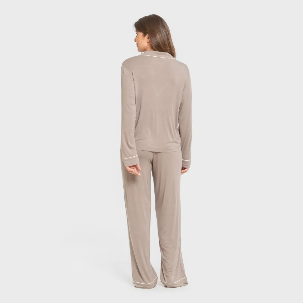 Conjunto de duas peças: camisa estilo camisado e calça comprida fluida.