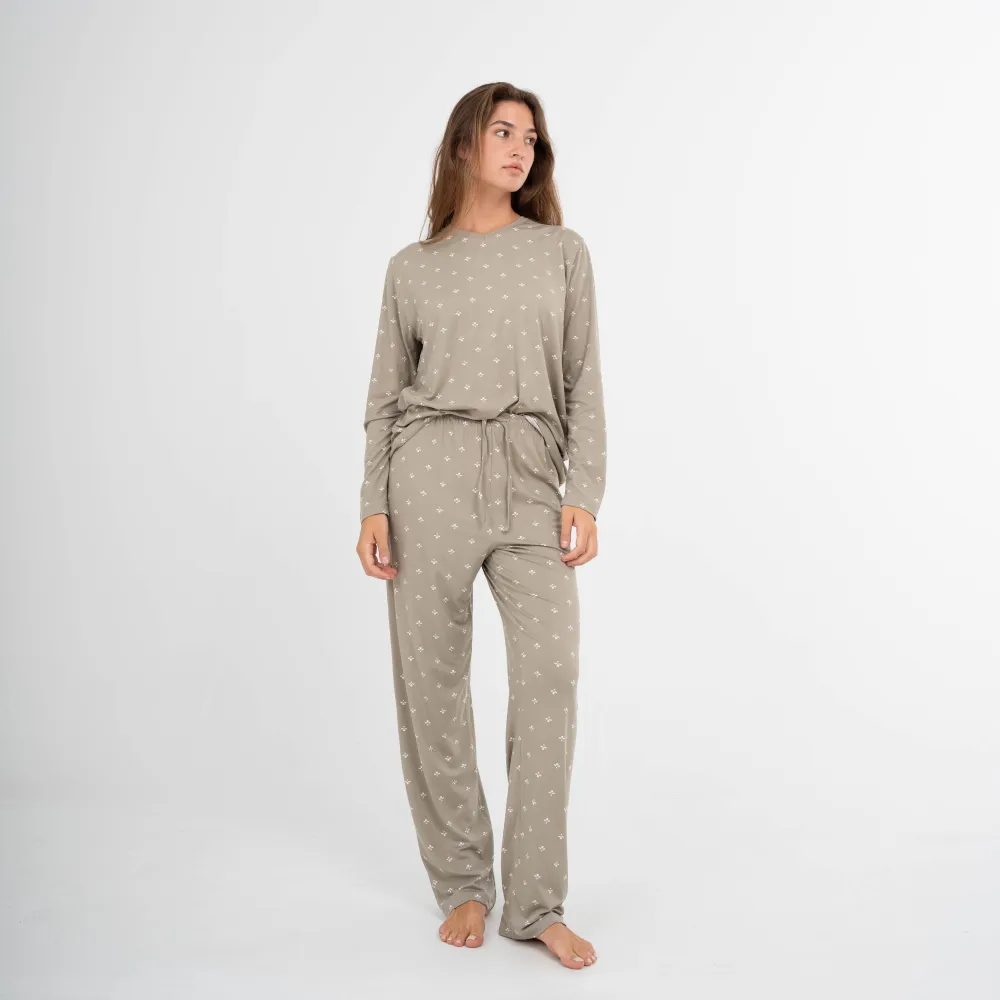 Pijama de mulher modelo Embera verde seco composto por camisola de manga comprida e calças compridas de toque suave.