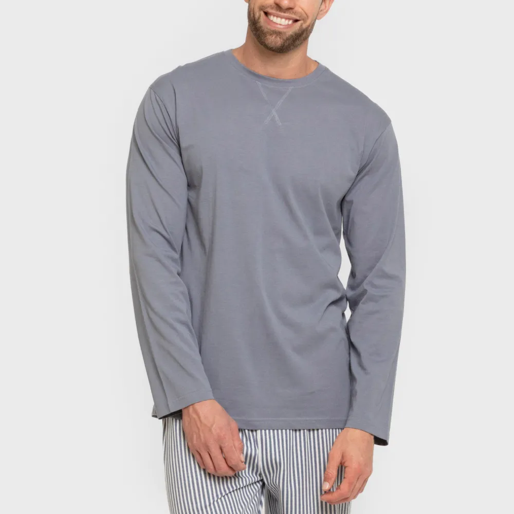 Pijama masculino composto por uma camiseta de manga comprida e calças compridas.
