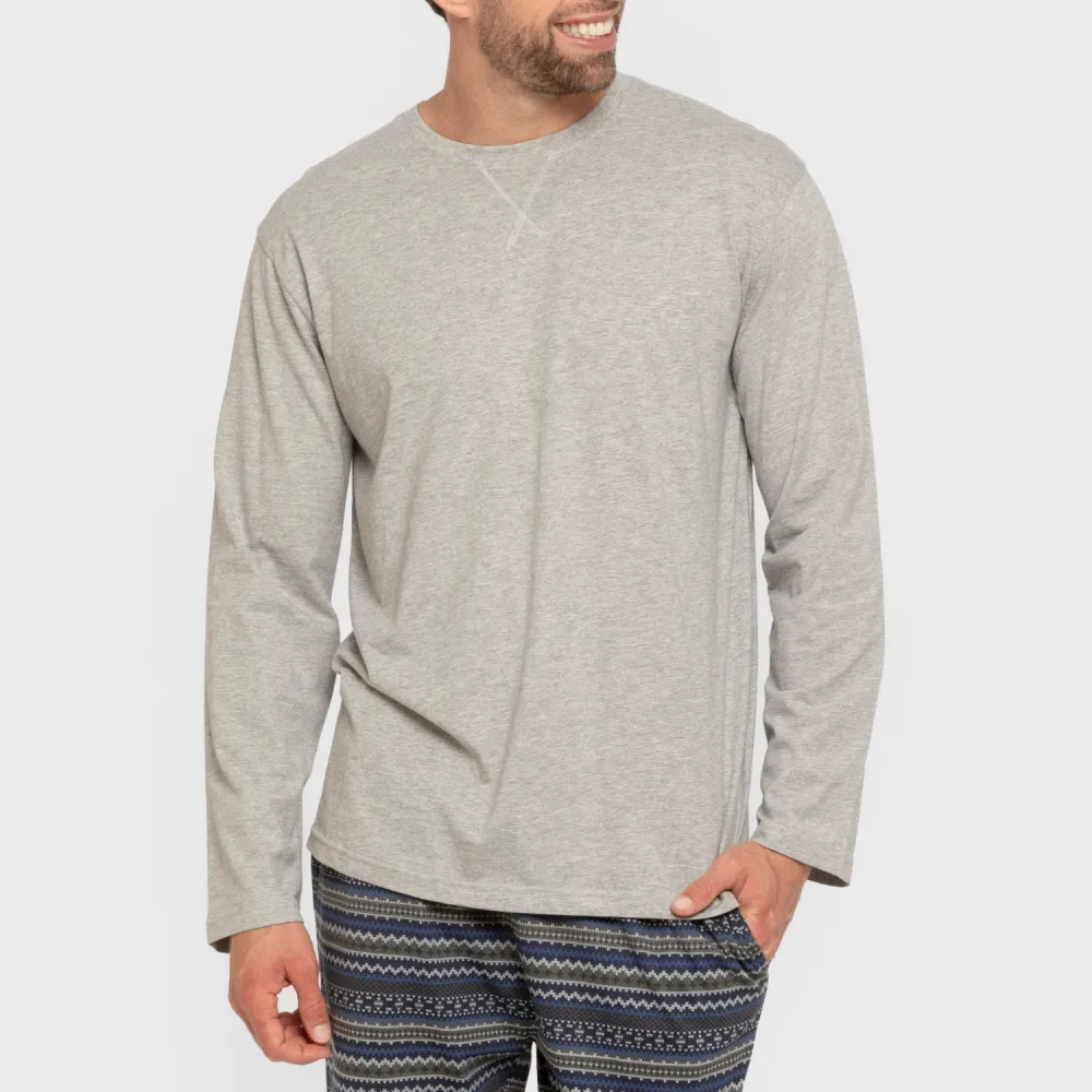 Pijama masculino composto por uma camiseta de manga comprida e calças compridas.