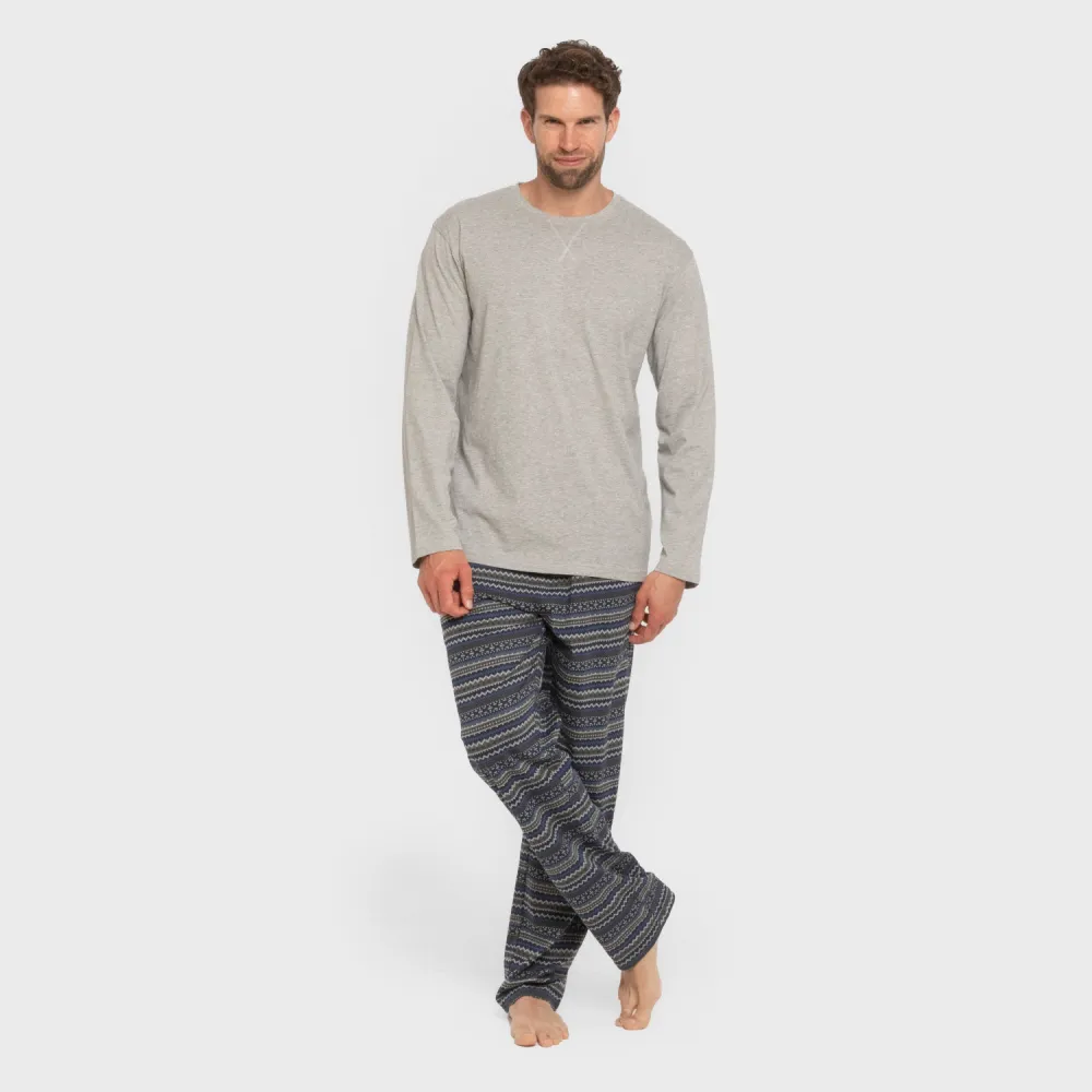 O pijama é composto por uma camiseta cinza lisa e uma calça azul marinho com uma estampa discreta em tons de branco, azul e cinza. As calças do pijama têm cós elástico para se ajustarem perfeitamente ao corpo.