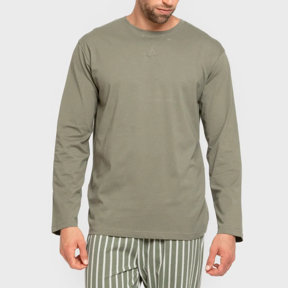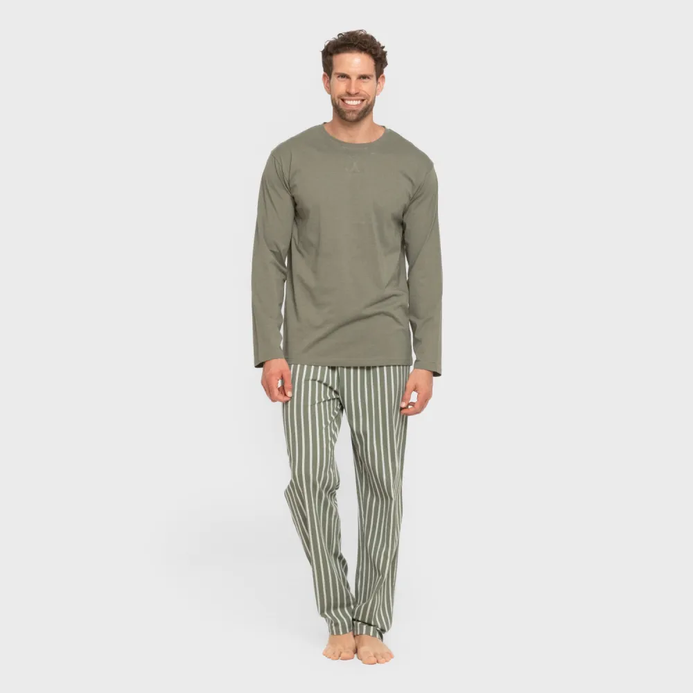 Pijama masculino composto por uma camiseta de manga comprida e calças compridas.