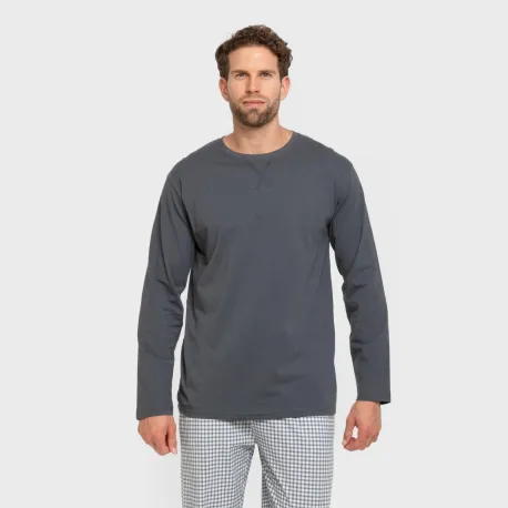 Pijama masculino composto por uma camiseta de manga comprida e calças compridas.