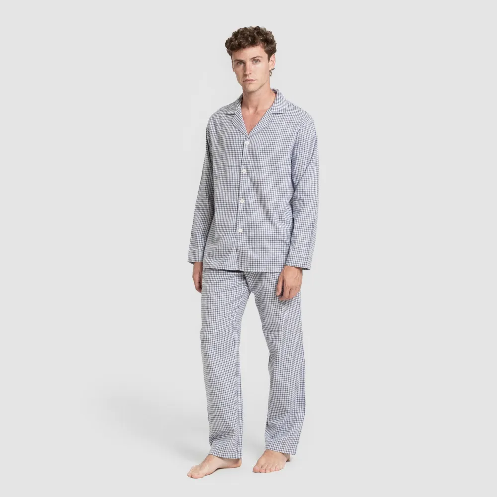 O pijama é composto por uma camiseta de manga comprida com gola e botões e uma calça com elástico revestido e cordão de ajuste. O seu design é clássico em branco com pequenos quadros azuis.