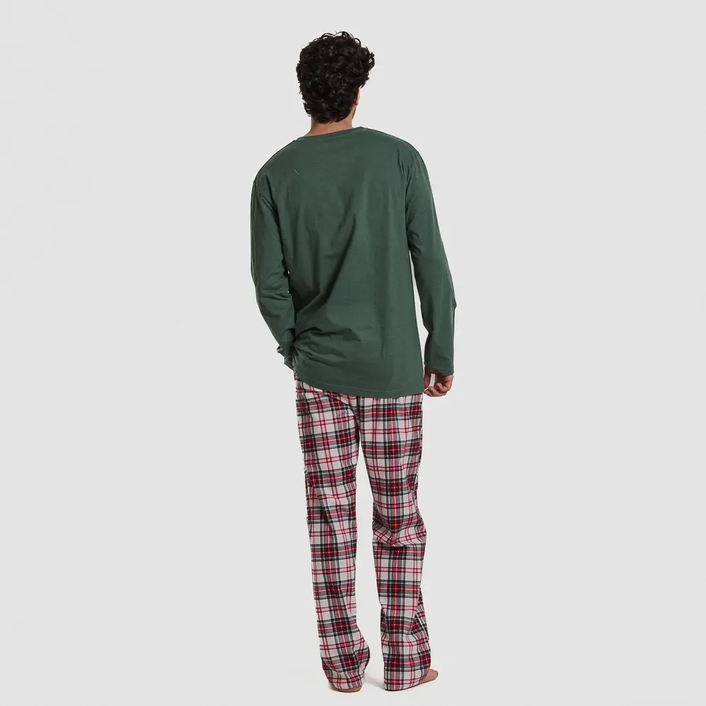 Camisola lisa de cor verde e calças aos quadrados vermelhos e verdes sobre um fundo branco. As calças do pijama têm cintura elástica com fita para ajustar.