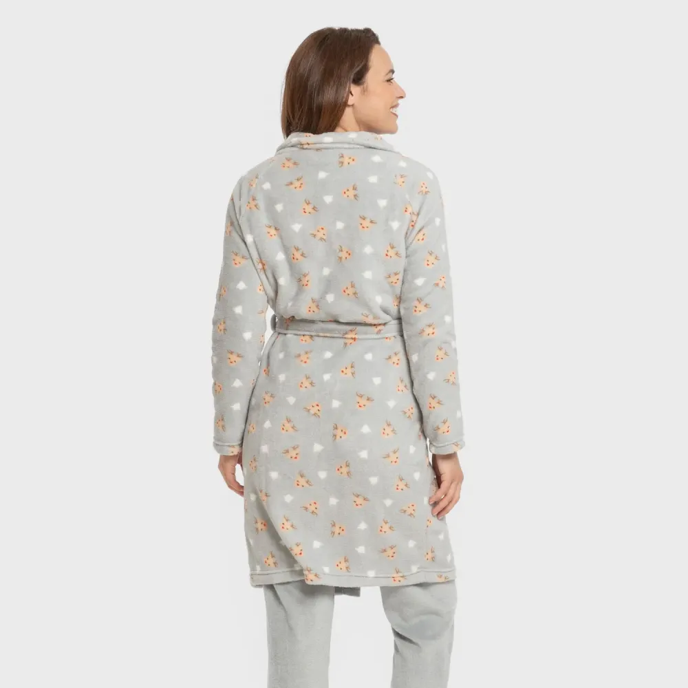 Robe com estampa natalina de renas e abetos sobre um fundo azul em tecido de coralina muito macio, ajustável com cinto.
