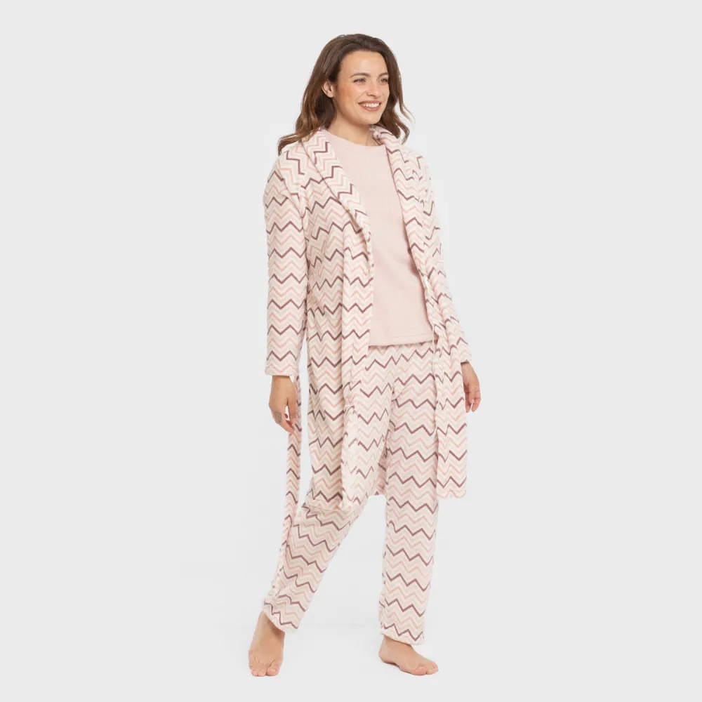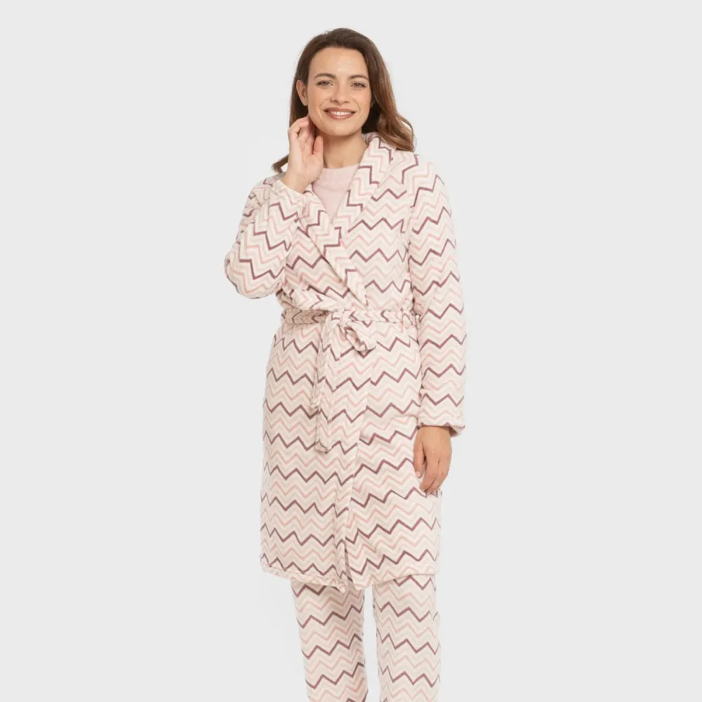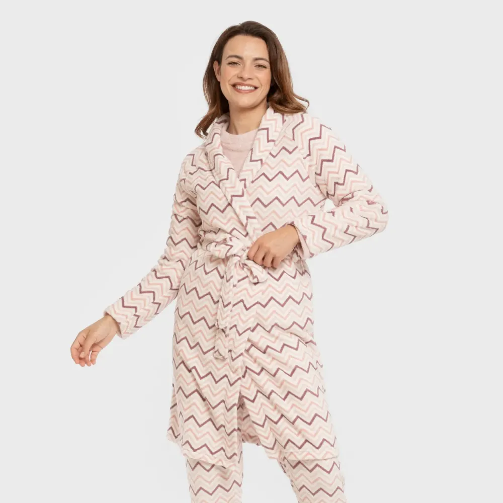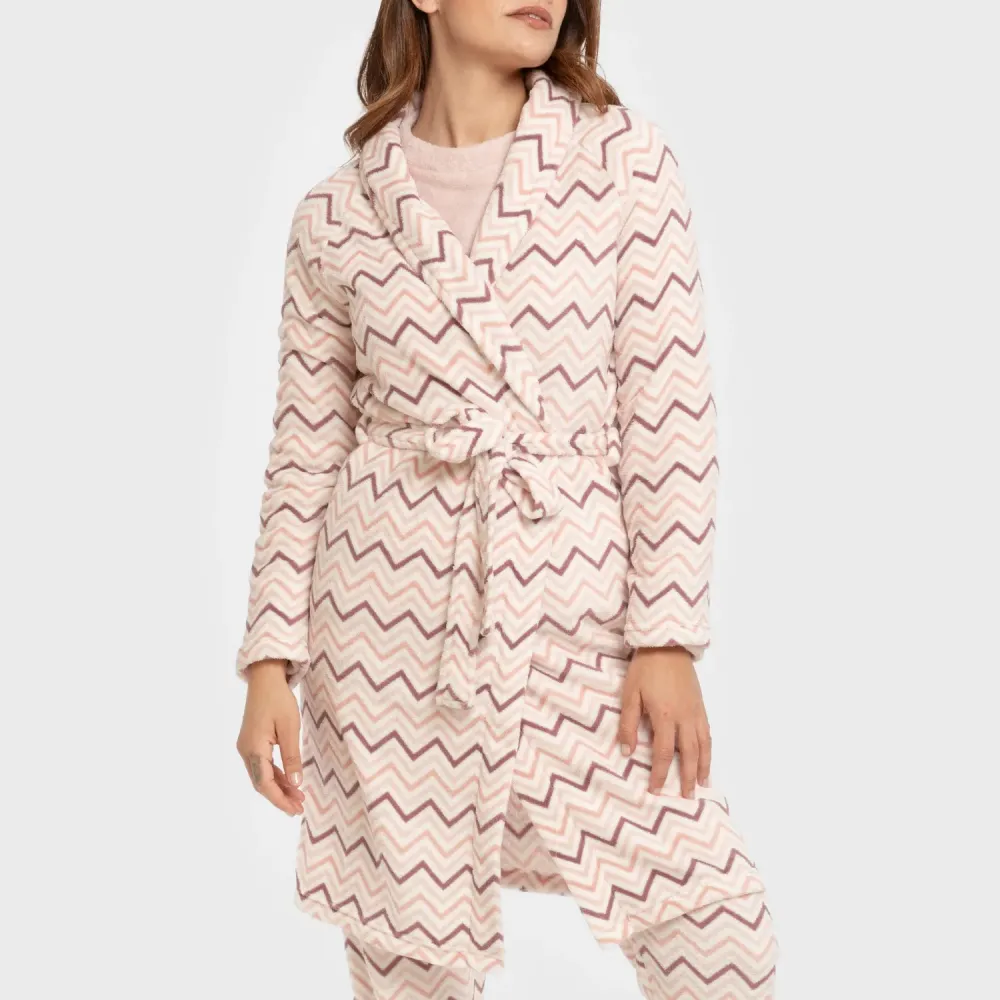Robe branco com estampa de ziguezagues em diferentes tons de rosa em tecido de coralina muito macio, ajustável com cinto.